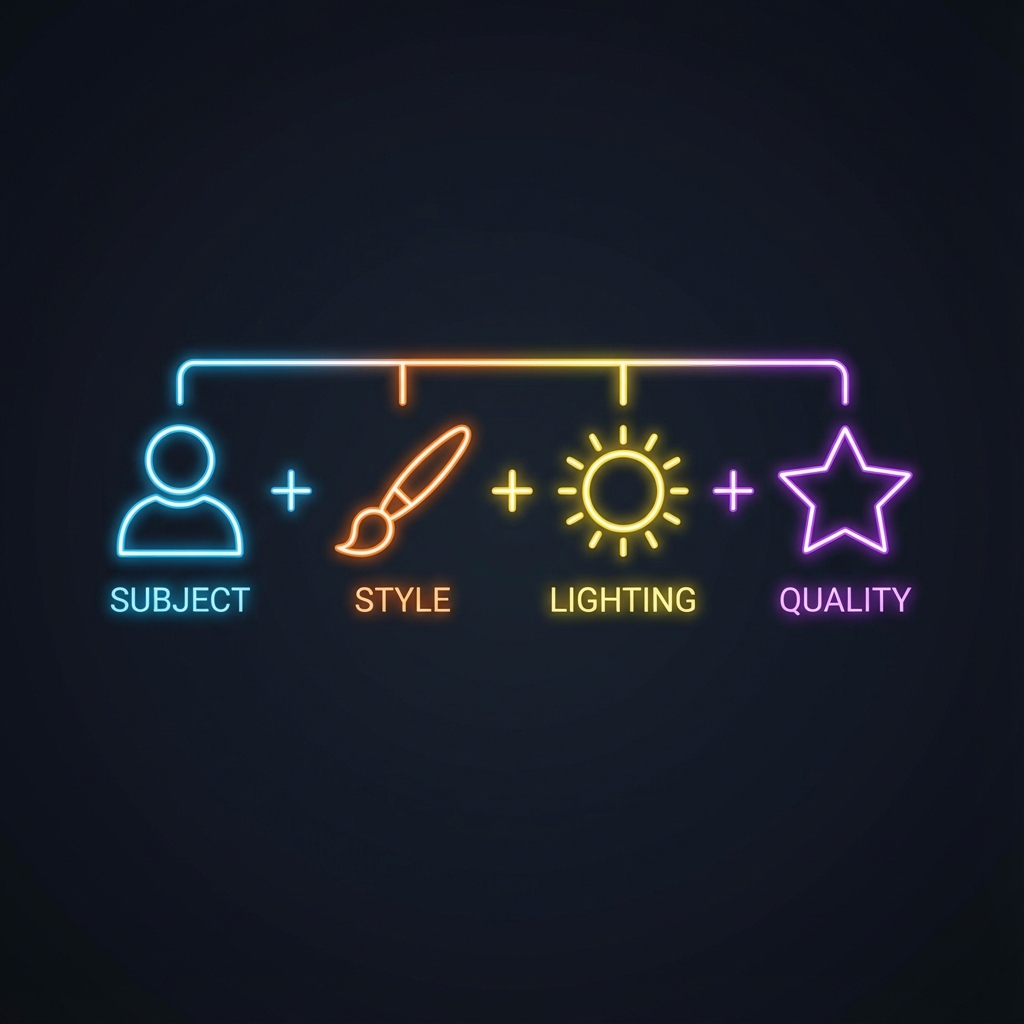 Put it together: "An adorable orange tabby cat (subject), sitting on a sun-drenched windowsill (environment/lighting), impressionist oil painting style (style), delicate brushstrokes, rich colors (quality/modifiers)."