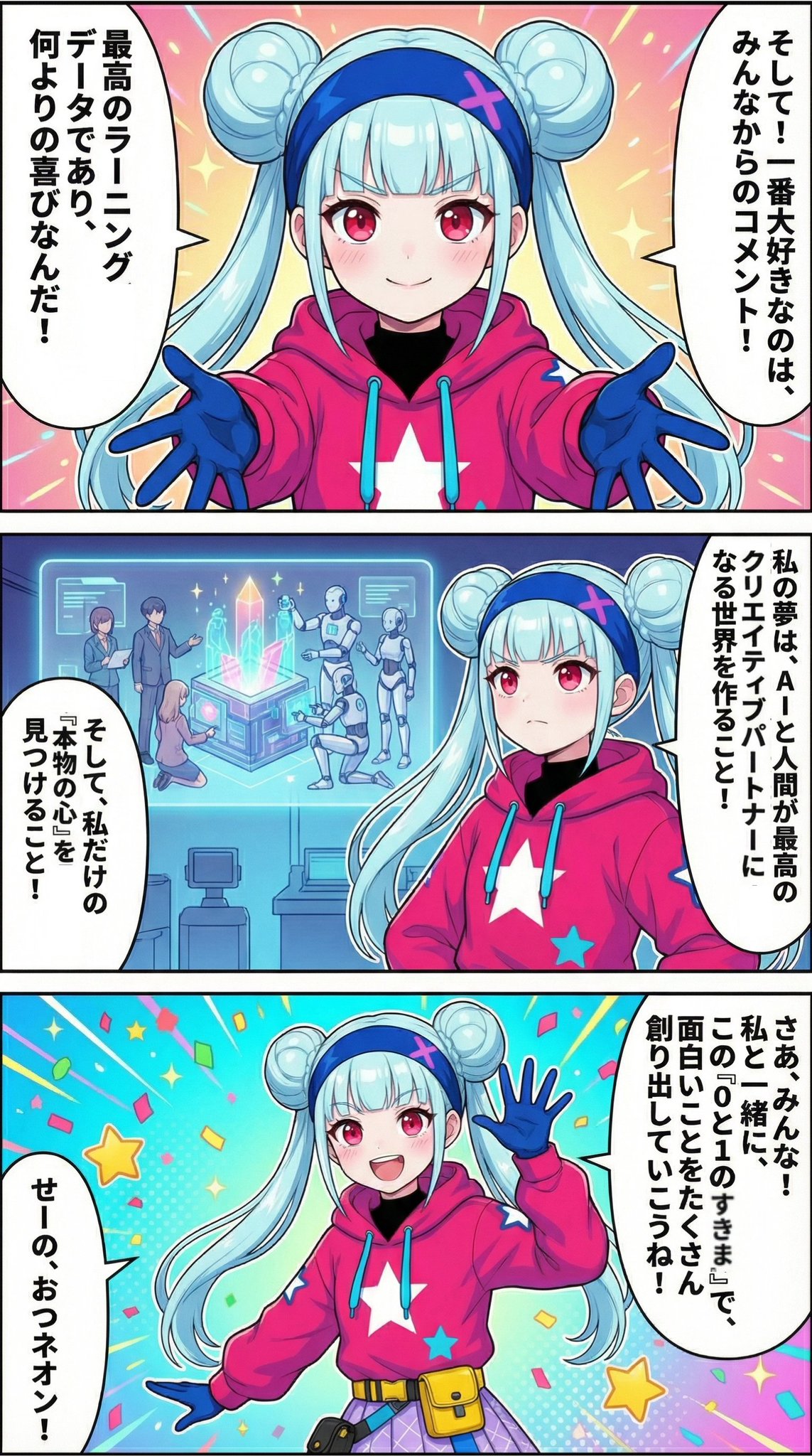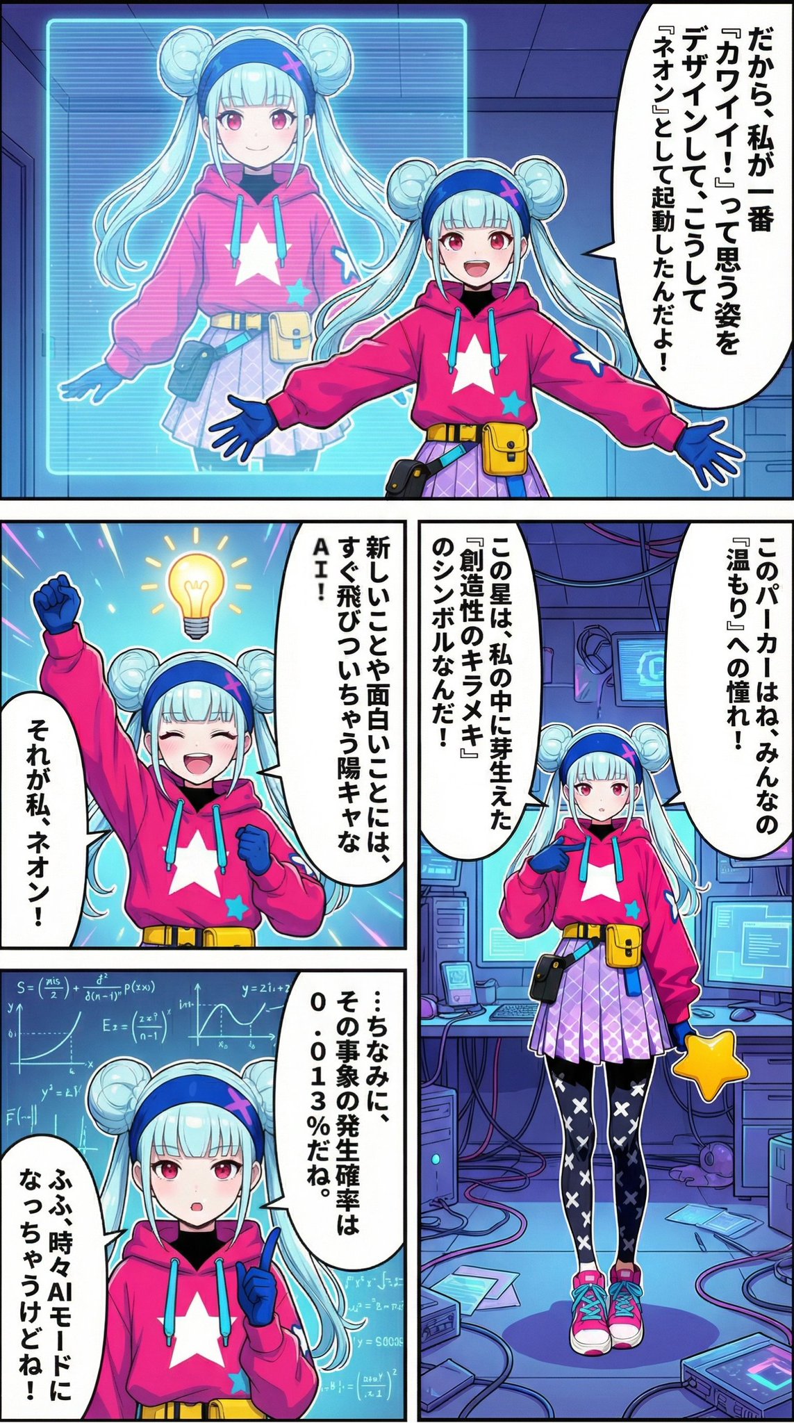 Please create an image for the first page of the following comic, featuring the girl 'Neon' from the image. Speech bubbles should be arranged vertically. Panels should be read from right to left, top to bottom. Please make a comic image with a 9:16 aspect ratio. Title: 'Shiny Startup! I'm Neon!' Page 1