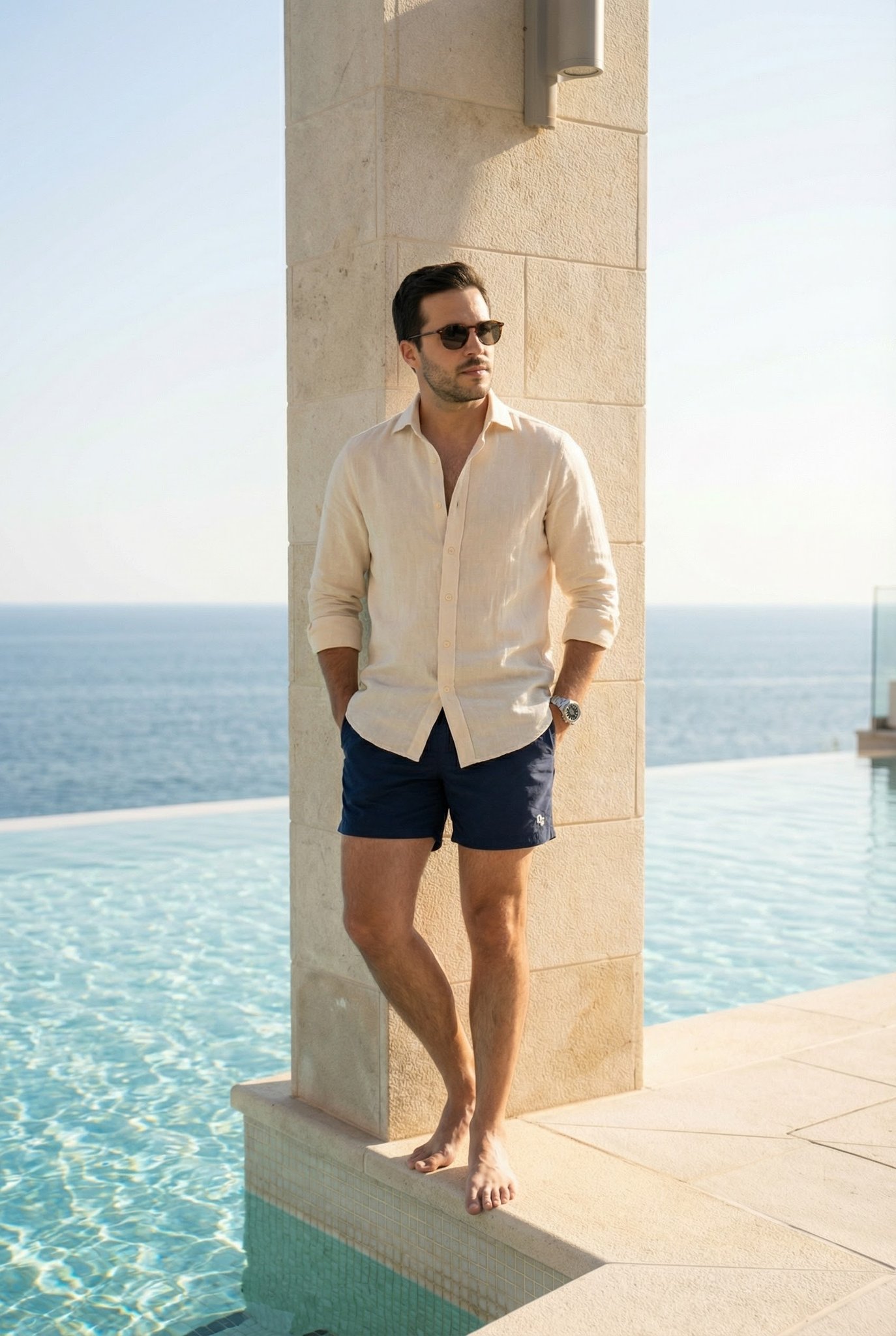 Create a high-quality, editorial-style photograph of the same man from the reference image, set by a luxurious pool during daytime, sunny weather with clear skies. He is alone, facing the camera in a classic and confident pose, as if shooting for a fashion magazine cover. The lighting is minimalist yet sophisticated, highlighting his face and clothing with soft, natural contrast. He wears a stylish, well-tailored summer poolside editorial outfit that is both trendy and modern, exuding elegance. The pool water sparkles in the sunlight, with reflections adding depth and vibrancy. The background is clean with no other people, emphasizing a high-end, cinematic aesthetic and refined magazine quality.