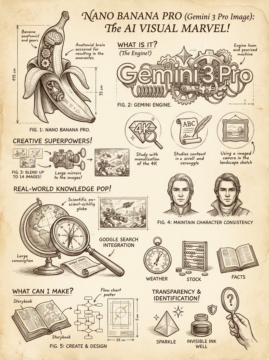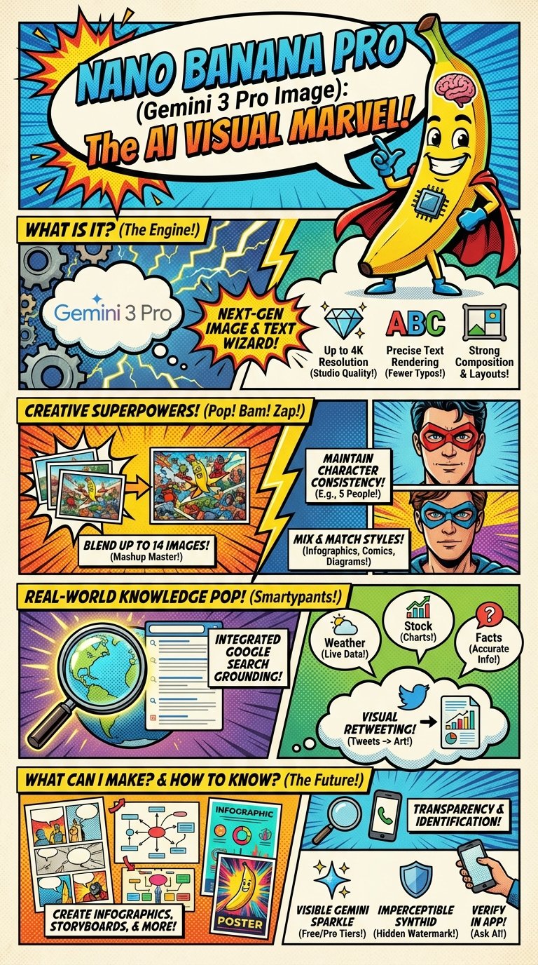 Create an infographic about Nano Banana Pro. Then, remake the above information into a vertical infographic in a cartoon style, pop art style, reorganizing the information to explain what people should know. Finally, choose a different style and different angle for the infographic.