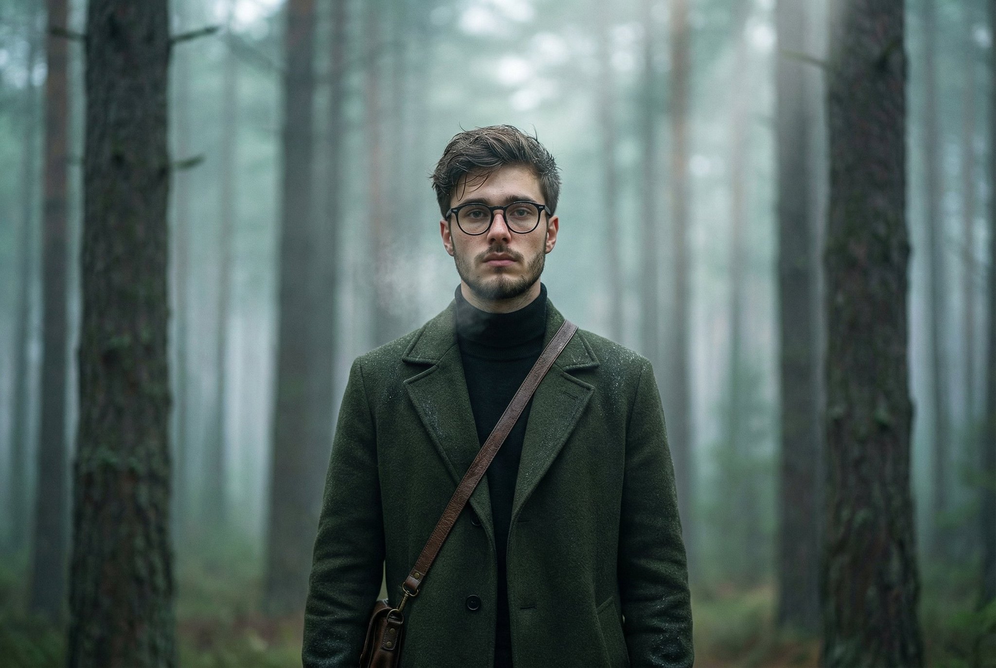"description": "The person wears a deep moss-green wool coat that sways slightly with movement; underneath is a charcoal gray turtleneck sweater; a vintage leather satchel is slung diagonally across the chest. Heavy boots show traces of wet mud and pine needles. Fine water droplets have condensed on clothing and hair, with visible drops on eyelashes and eyebrows.",