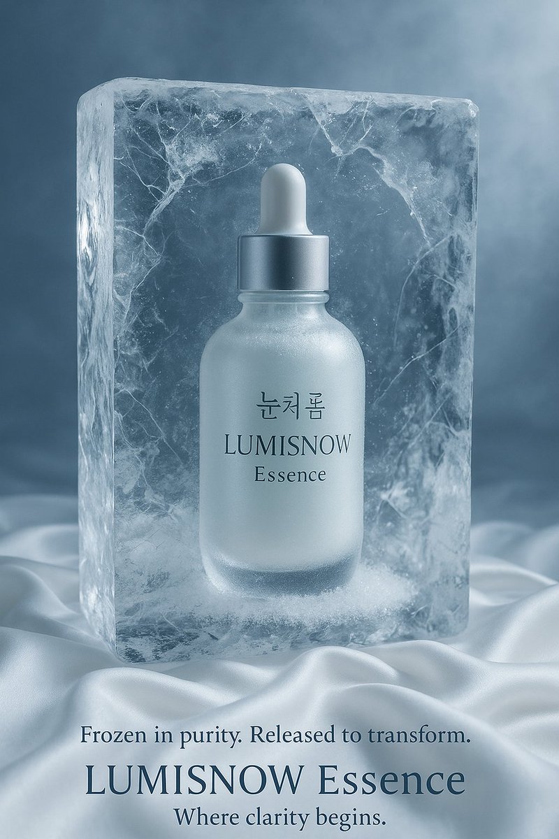 Imagine a visual concept where [insert your product] — featuring Korean text on the label — is suspended inside a cracked, ultra-clear block of ice. The product is fully visible through the ice, with soft frost forming around it. It rests on smooth white silk, and the ambient lighting is cold and elegant, with reflections dancing across the surface. Describe the entire scene in rich visual detail, in the style of a luxurious Korean skincare advertisement.