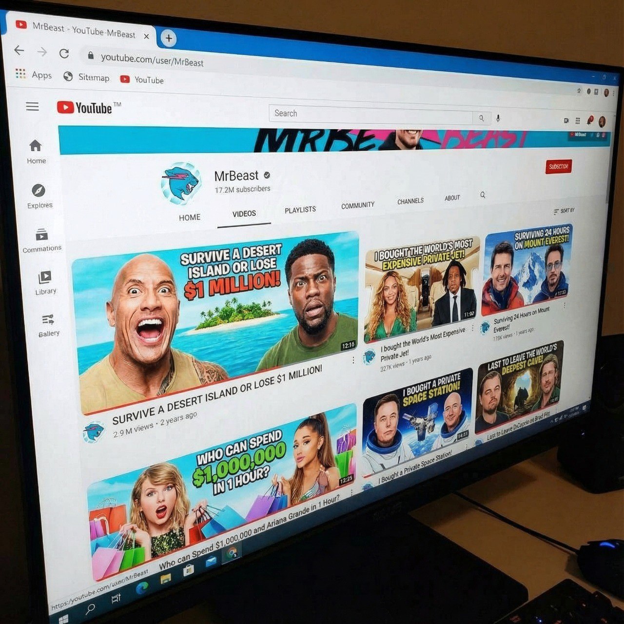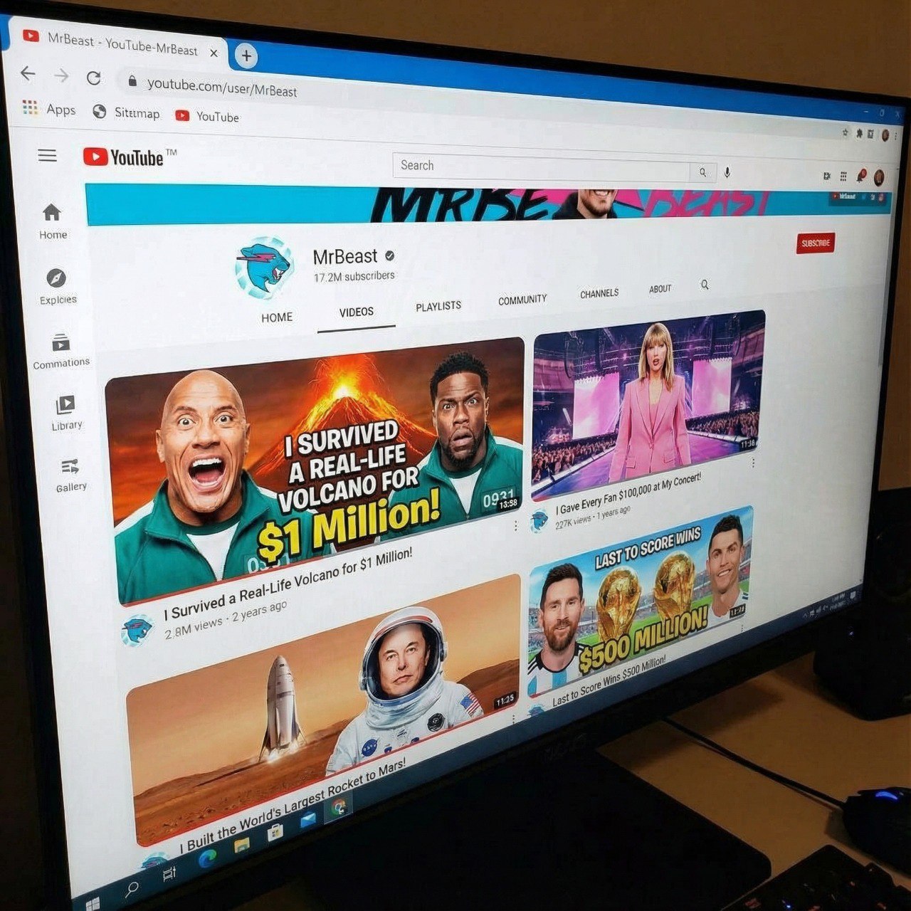 A YouTube channel page identical to the real MrBeast channel page, with camera angle and viewpoint consistent with the reference photo. Keep the YouTube interface, channel banner, icon, buttons, and sidebar completely unchanged. Replace all video thumbnails with brand new custom thumbnails about "Nano Banana VS Cartoon Banana Boxing Championship".