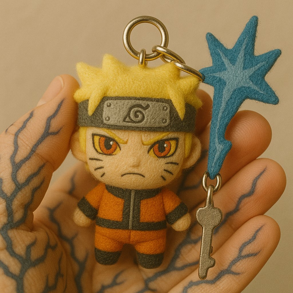 Close-up photo of a small plush keychain of [attached image/emojis] held gently between two fingers, made of soft felt or fuzzy material, cartoon-style proportions, embroidered face with simple expressive features, character designed to resemble, attached to a shiny silver keyring, neutral beige background, shallow depth of field, soft natural lighting, highly detailed texture, cute and handcrafted aesthetic, studio photography, 1:1 aspect ratio