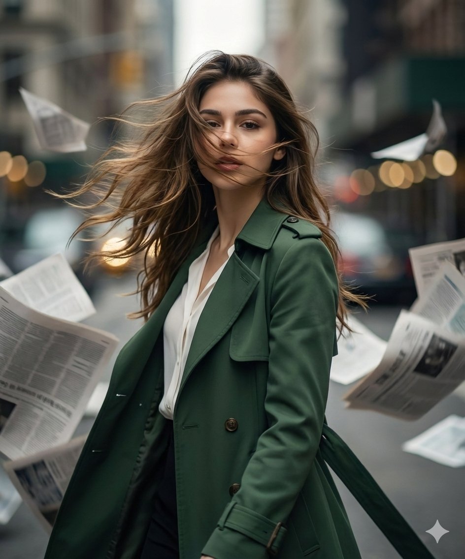 Fashion cinematic editorial portrait, medium shot. A figure facing the camera amidst a windstorm on an urban street. Hundreds of flying newspapers and debris swirling in the air, with strong horizontal motion blur in the background and papers conveying extreme speed and wind force. The figure wearing [insert clothing details here]. Face remains in sharp focus with hyperrealistic skin texture and dramatic lighting, while the environment is blurred. Vogue aesthetic, 8K resolution, masterpiece, depth of field, freeze-frame shot. negative_prompt: static, calm, still air, blurry face, distorted features, cartoon, illustration, 3D render, poor anatomy, watermark, low quality, noise, grain, ugly, deformed.