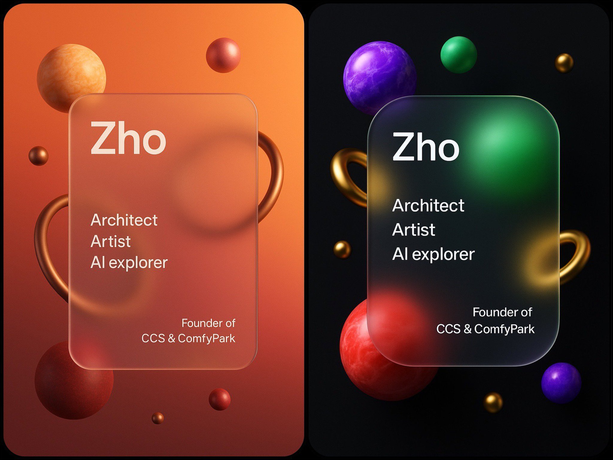 Generate a highly modern glassmorphism-style visual design mockup image 3:4 ratio Center-right 1/3 position features a semi-transparent glass texture rounded rectangle panel with soft edges, blur background and gradient lighting effects. The panel contains the following text: • Top left: Zho • Bottom left: Architect Artist Ai explorer • Right side small text: Founder of https://t.co/s6eXbY9EAY