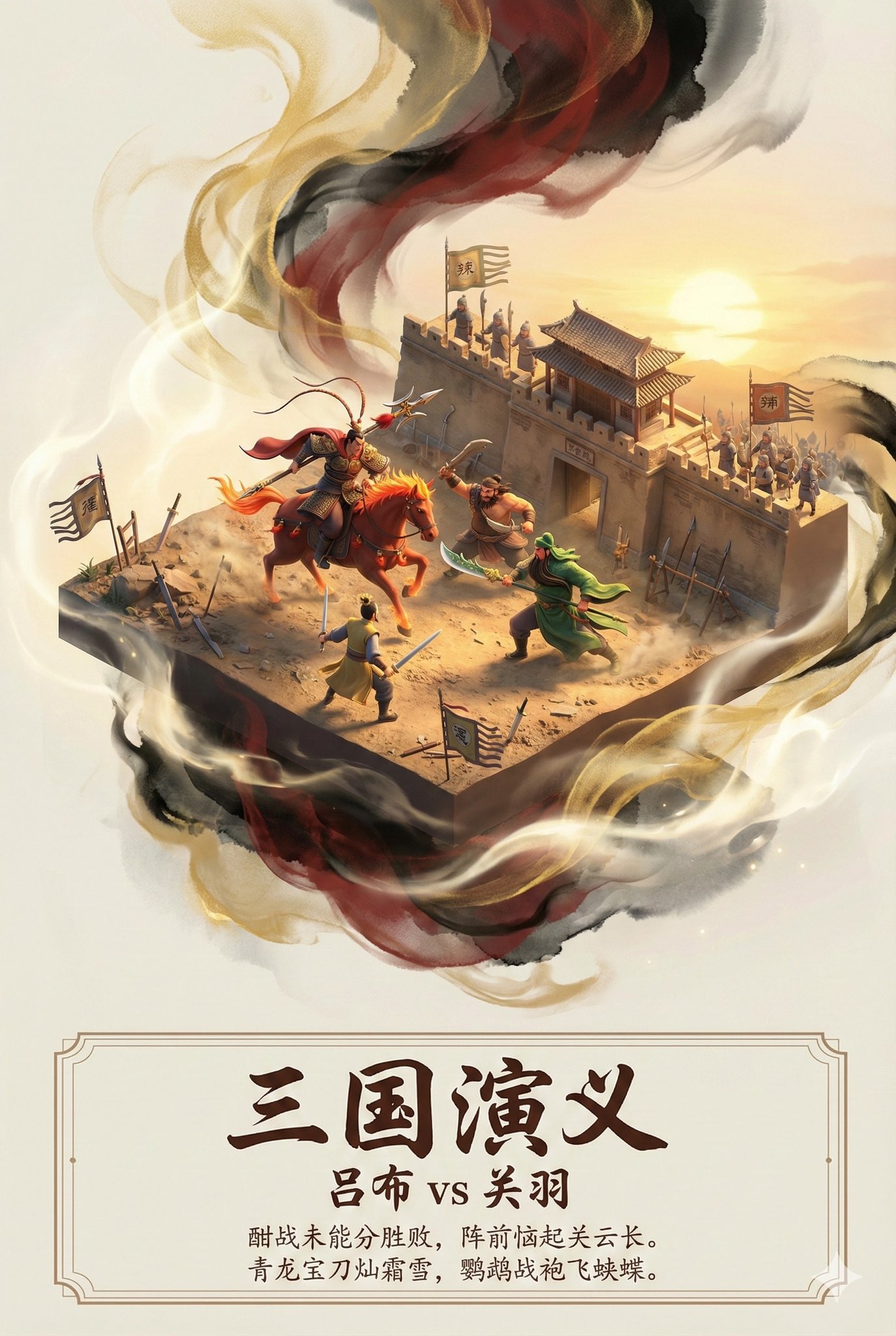 Prompt: Please design a high-quality 3D poster for the TV series/novel "Romance of the Three Kingdoms". First, retrieve information about the series/novel and its famous scene segments. Using your knowledge base, find the most representative famous scene or core location. In the center of the image, construct this scene as an exquisite isometric 3D miniature model. The style should adopt DreamWorks Animation's delicate, soft rendering approach. Restore the architectural details, character dynamics, and environmental atmosphere of that time—whether it's a storm or a peaceful afternoon, naturally blend it into the model's lighting. For the background, don't use a simple pure white base. Create a void environment around the model with faint ink wash effects and flowing light mist, with elegant tones that give the image a sense of breathing and depth, highlighting the preciousness of the central model. Finally, for the bottom layout, generate Chinese text. Center the novel's name with a font design that matches the original work's style. Below the title, automatically retrieve and typeset a classic description or dialogue from the original work about this scene, using an elegant serif font. The overall layout should be as refined and balanced as a high-end museum artifact nameplate.