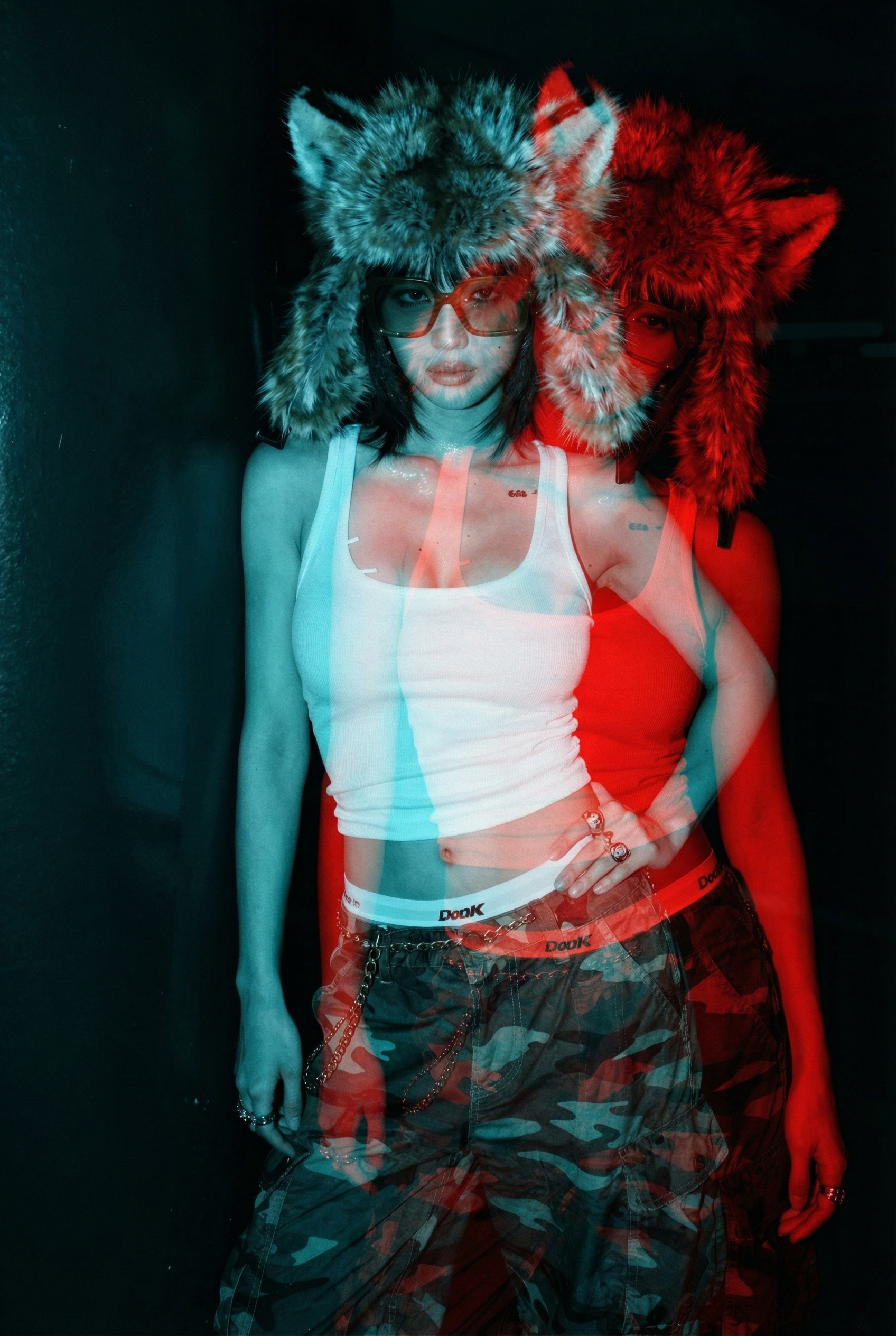 Artistic Red-Blue Double-Exposure Effect: Two Poses of the Same Woman