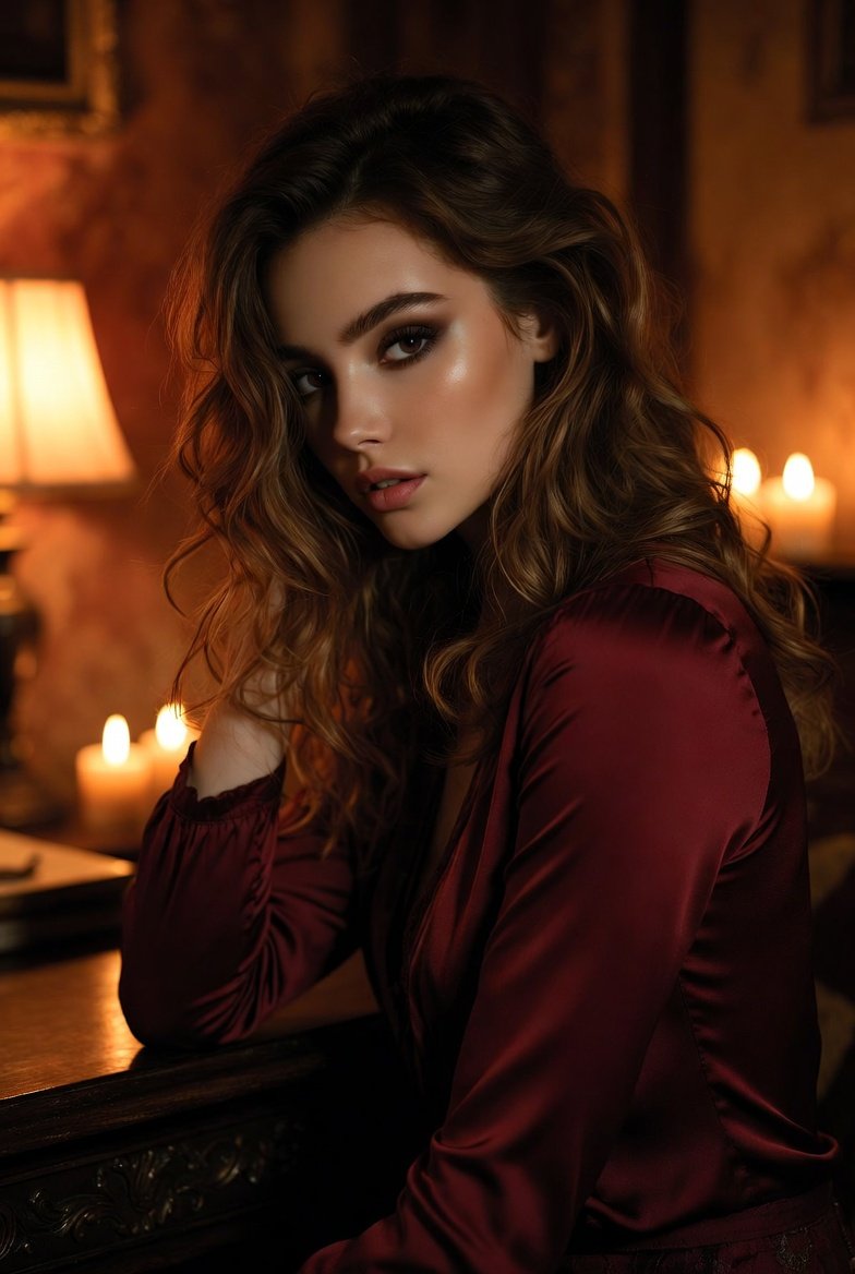 This girl has the most beautiful eyes to melt your heart. Images from Google Gemini Nano Banana Prompt A high-quality portrait photograph shows a beautiful woman with long, wavy brown hair and sultry makeup, including dark eyeshadow and a nude lip, looking directly into the camera. She is seated in a dimly lit, old-fashioned room, wearing a deep burgundy satin wrap dress, with her arm resting on an antique wooden desk. The warm glow of a nearby table lamp and several flickering candles illuminates the scene, casting soft light and deep shadows across her face, hair, and the rich textures of her clothing and the wood. The background is softly blurred but suggests heavy velvet curtains and aged wallpaper, enhancing the intimate and moody atmosphere.