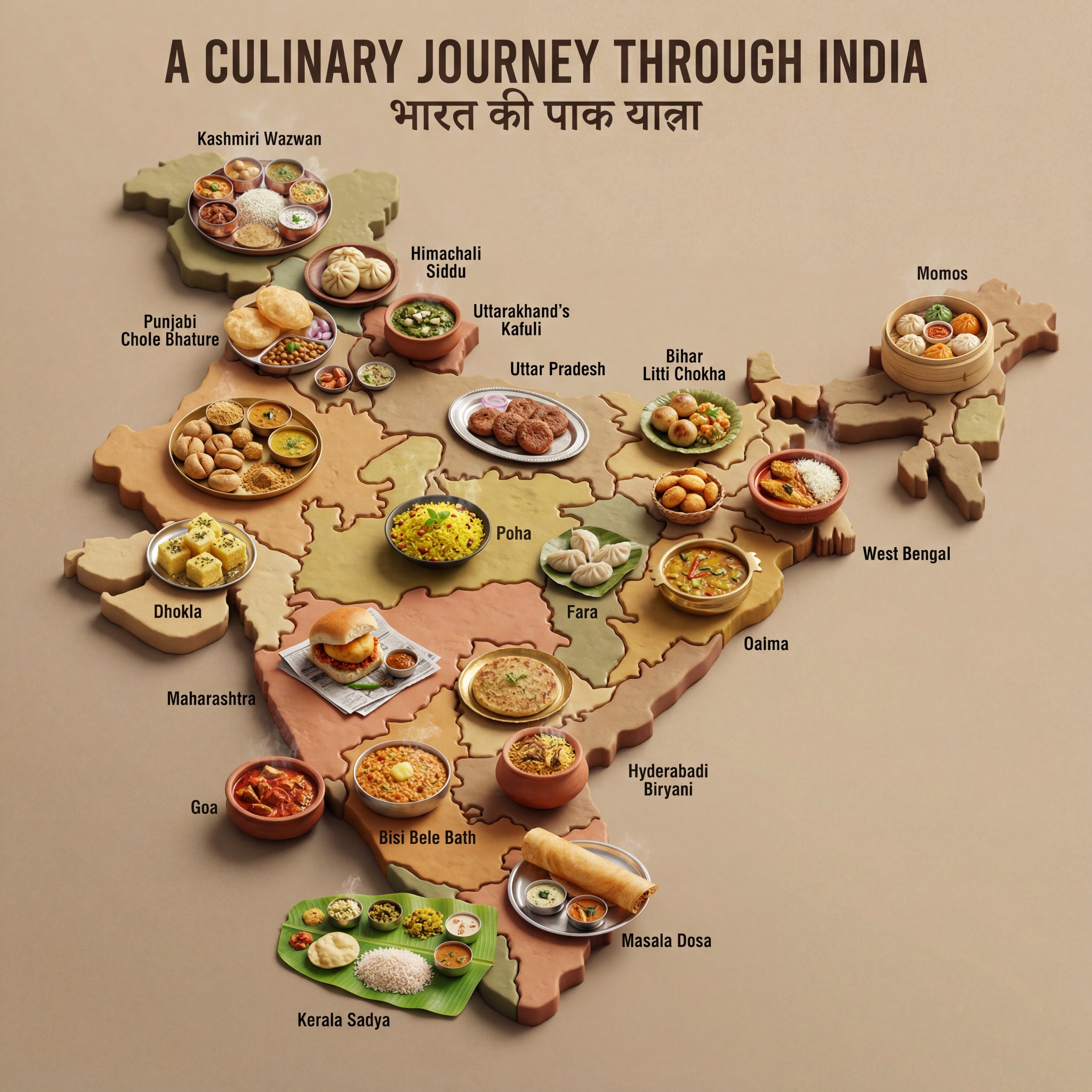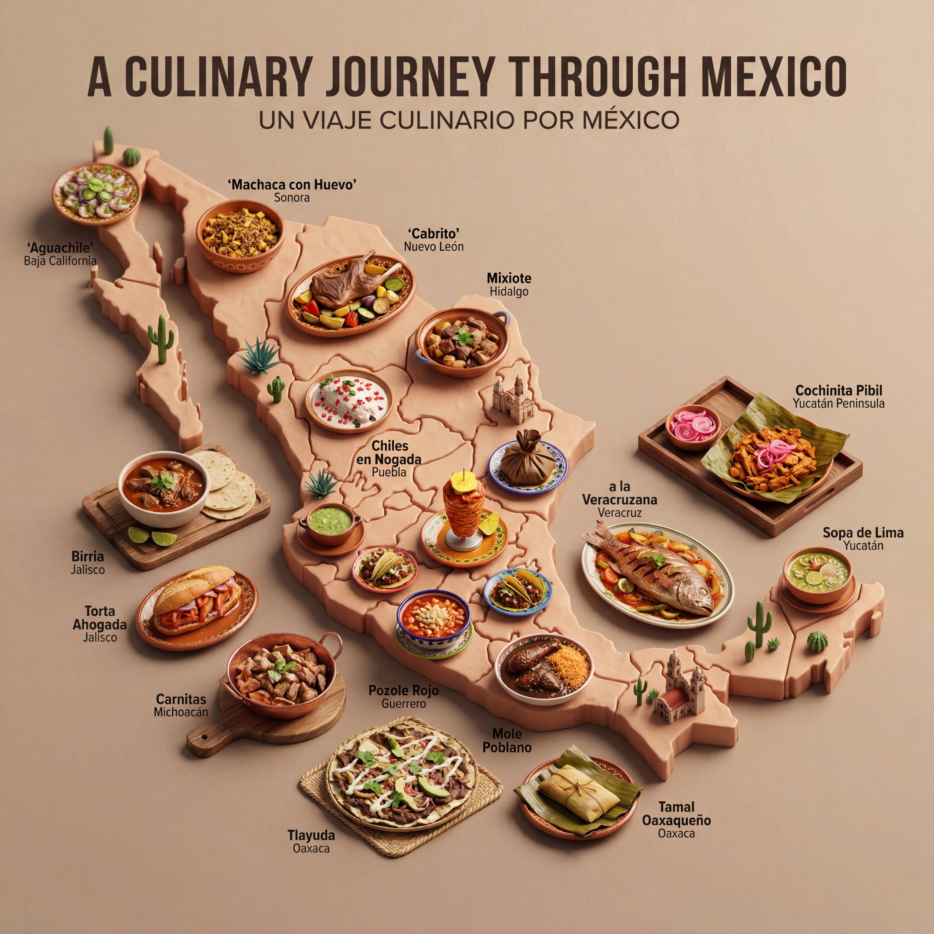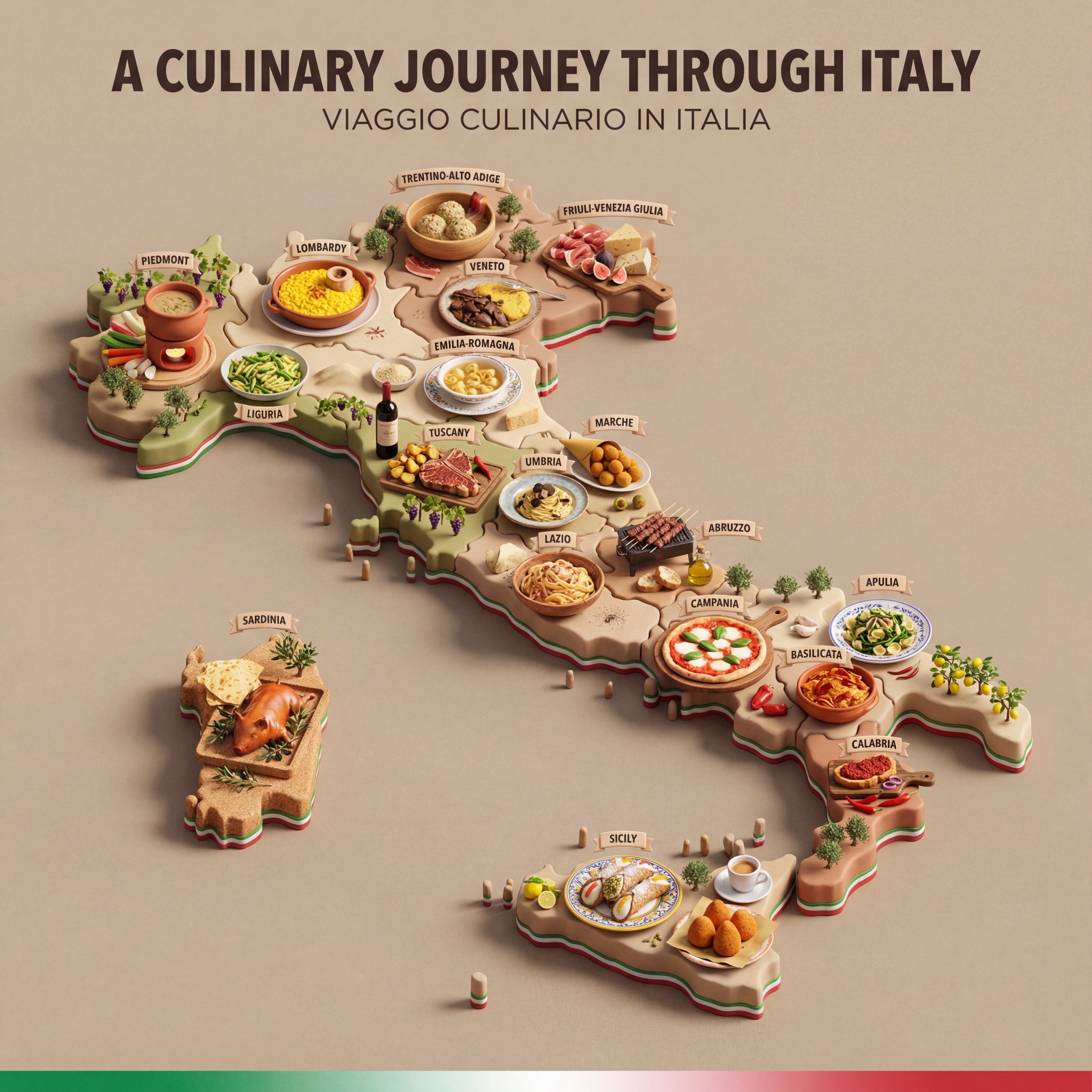 Generate a stunning 3D isometric illustrated map of {COUNTRY NAME} featuring famous regional cuisine from every state/province/region.