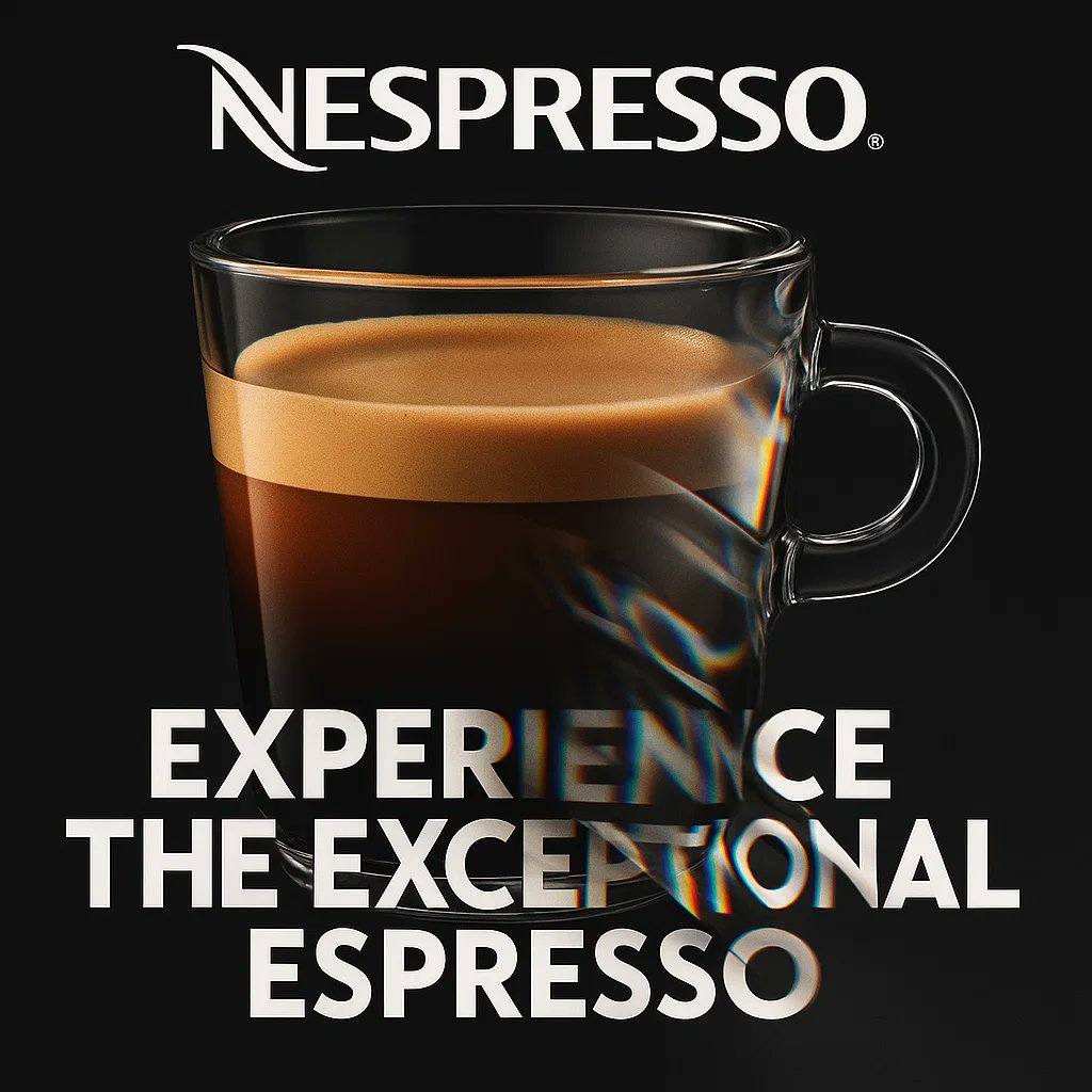 Design a cinematic brand poster featuring “[BRAND NAME]” — include a bold six-word slogan beneath — apply a 3D glass refraction effect that distorts part of the text or layout — incorporate the brand logo in the top corner — smooth shadows, glossy lighting, black extra-bold typography — clean modern background — high-resolution, 1:1 aspect ratio
