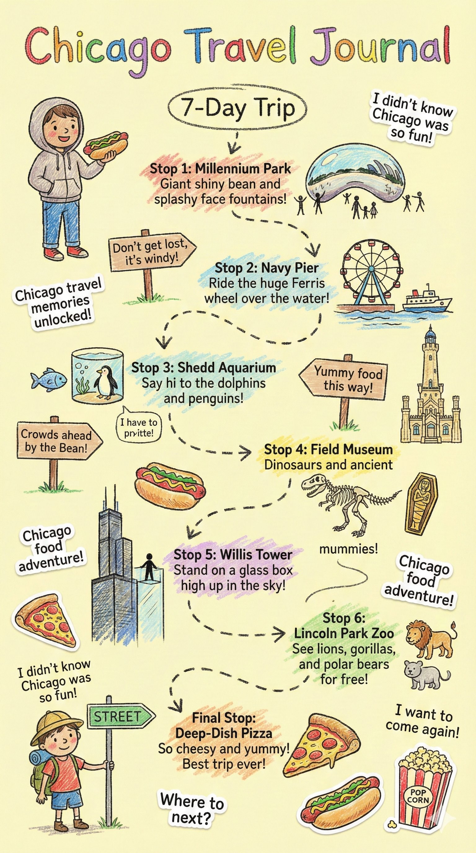 This prompt generates a vibrant, child-like crayon-style vertical (9:16) travel-journal illustration for a {City Name} trip, automatically creating a winding route with daily recommended attractions, cute doodles, local landmarks, foods, and playful handwritten notes. The tone is warm, fun, and full of childlike curiosity.