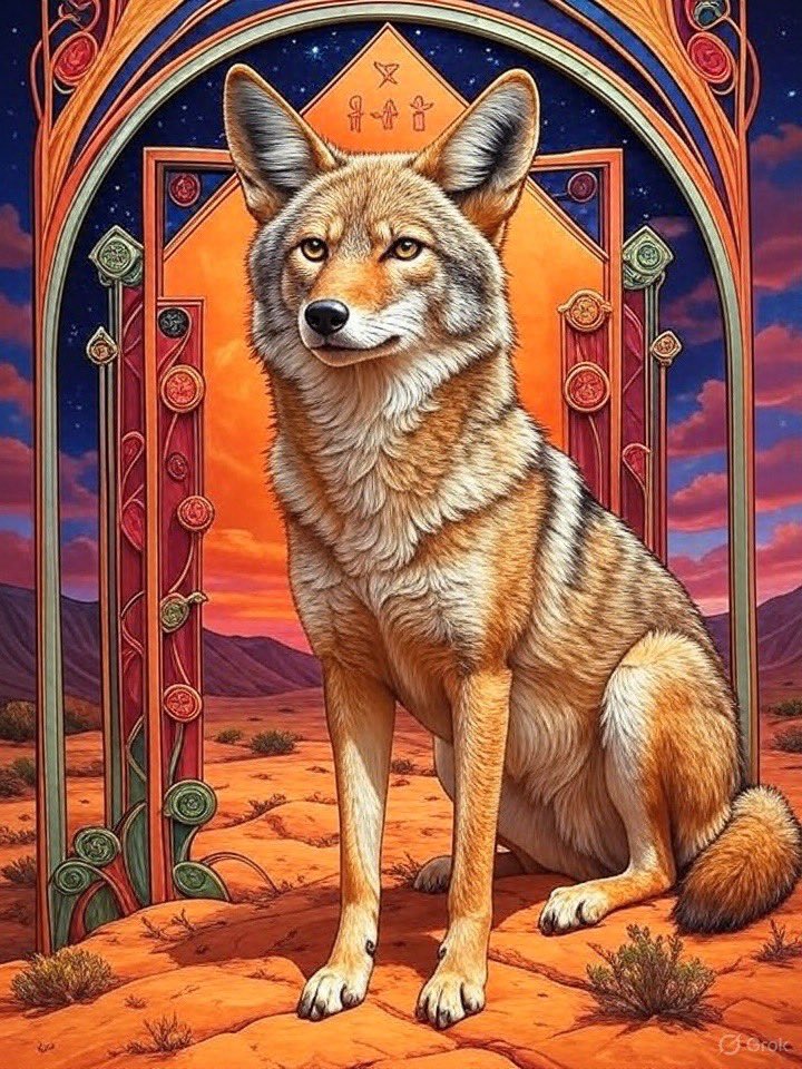 A bison in the center of an array of colorful geometric shapes, surrounded by symbols representing different aspects like family and home. The artwork features warm colors in an oil painting style, with an Art Nouveau illustration showcasing ornate details and colorful patterns. The scene also includes a night sky and desert landscapes. The artwork should have a rich texture and a three-dimensional effect with intricate detailing.