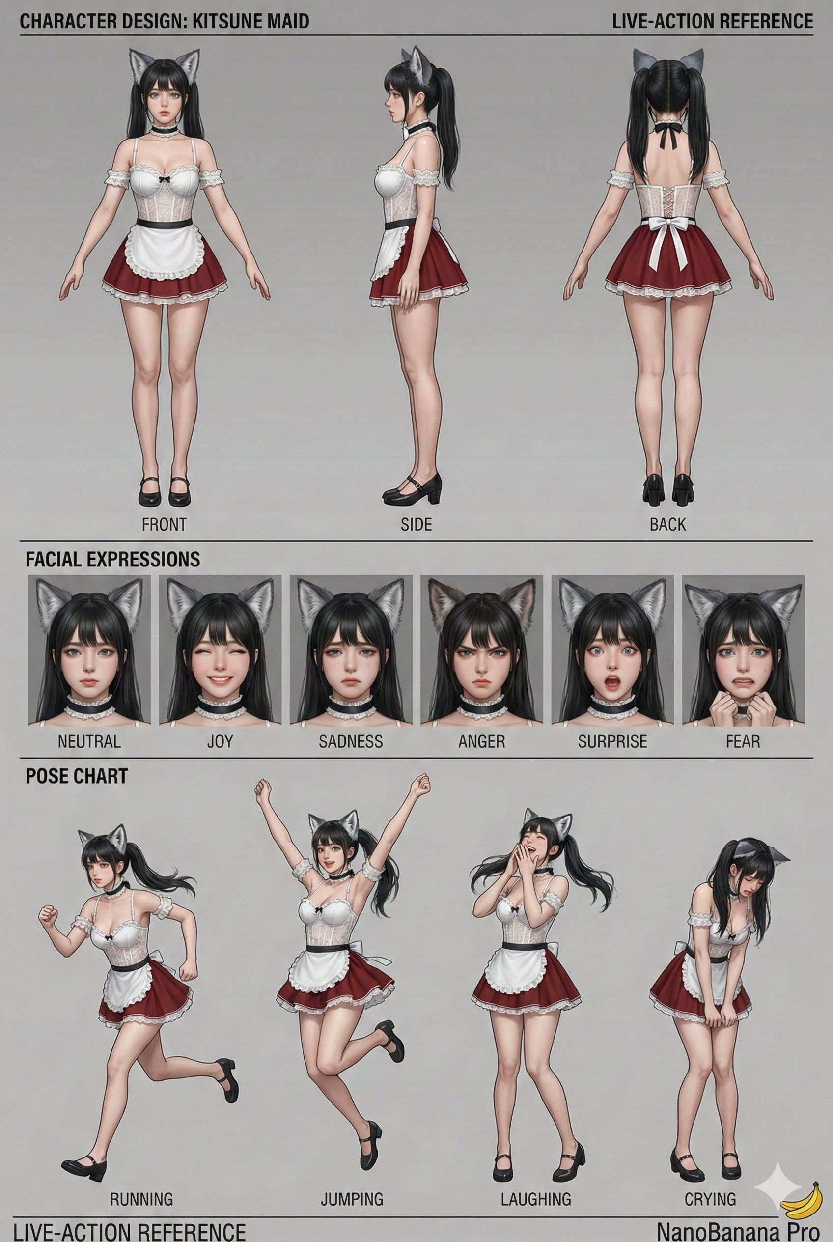 z-image: Scene - cozy maid cafe or private bar counter at night. Young East Asian woman with long black hair in low twin tails, wearing fluffy gray wolf ears headband, white frilly off-shoulder maid blouse with black ribbon details and ultra-short black maid skirt with white lace trim, leaning forward over wooden counter with both hands, looking back over shoulder toward camera with playful expression. Background: dimly lit shelves with bottles and glasses, warm hanging lamps.