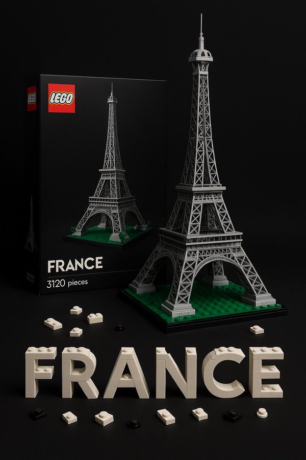 a realistic LEGO-style set featuring [COUNTRY]’s national treasure: [ITEM]. Photorealistic packaging with LEGO branding, box art showing the built model, the model assembled from LEGO bricks in authentic colors and details. Studio product photography with soft shadows and clear lighting, highly detailed, professional commercial render. Include box and bricks in the scene, focus on realism and LEGO-like style. 9:16.