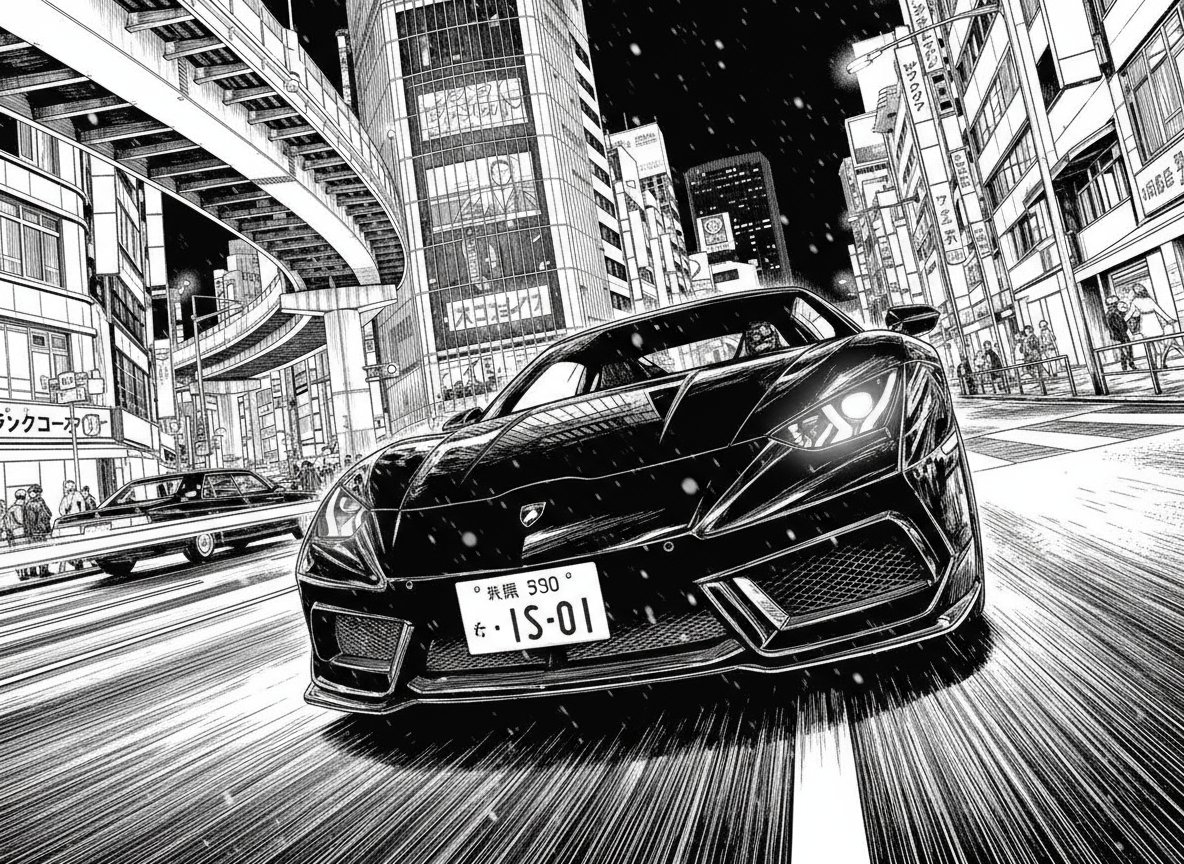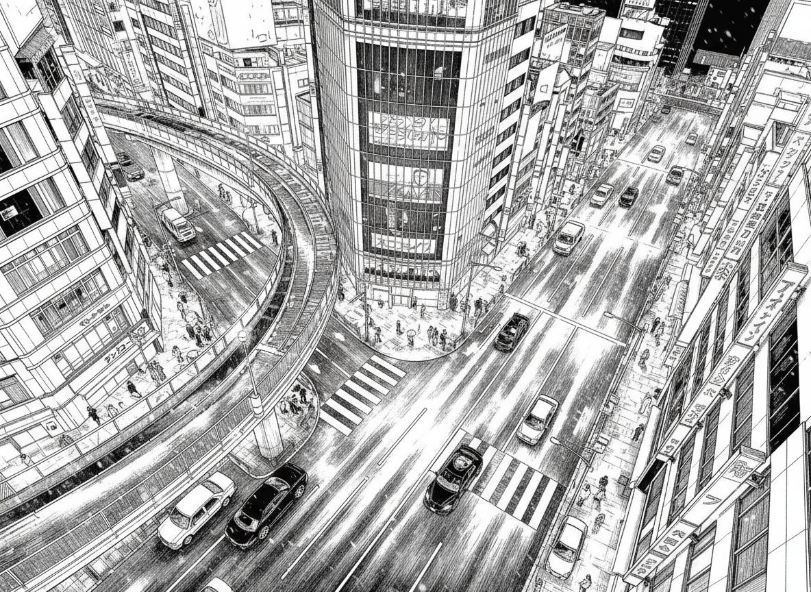 nano banana manga background generation: 1/ Draw a car driving through Tokyo's busy streets (Enter 1, then ↓) 2/ Make it black and white manga-style line art (Enter 2, then ↓) 3/ Make it bird's eye view 4/ Make it a low angle looking up composition, zoom in on the car. It's good at this kind of thing.