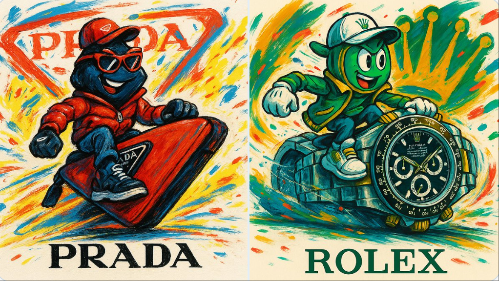 A fictional character shaped like a [Brand Name] product, wearing clothing that reflects the brand’s identity, sitting or riding on an oversized version of one of the brand's products as if it were a futuristic vehicle. The design features an expressive, dynamic artistic style full of motion and vibrant colors, with a large abstract version of the brand’s logo in the background. Freely drawn elements and colors representing the brand are scattered throughout. The background is light-colored, and the brand’s logo appears at the bottom. aspect 1:1