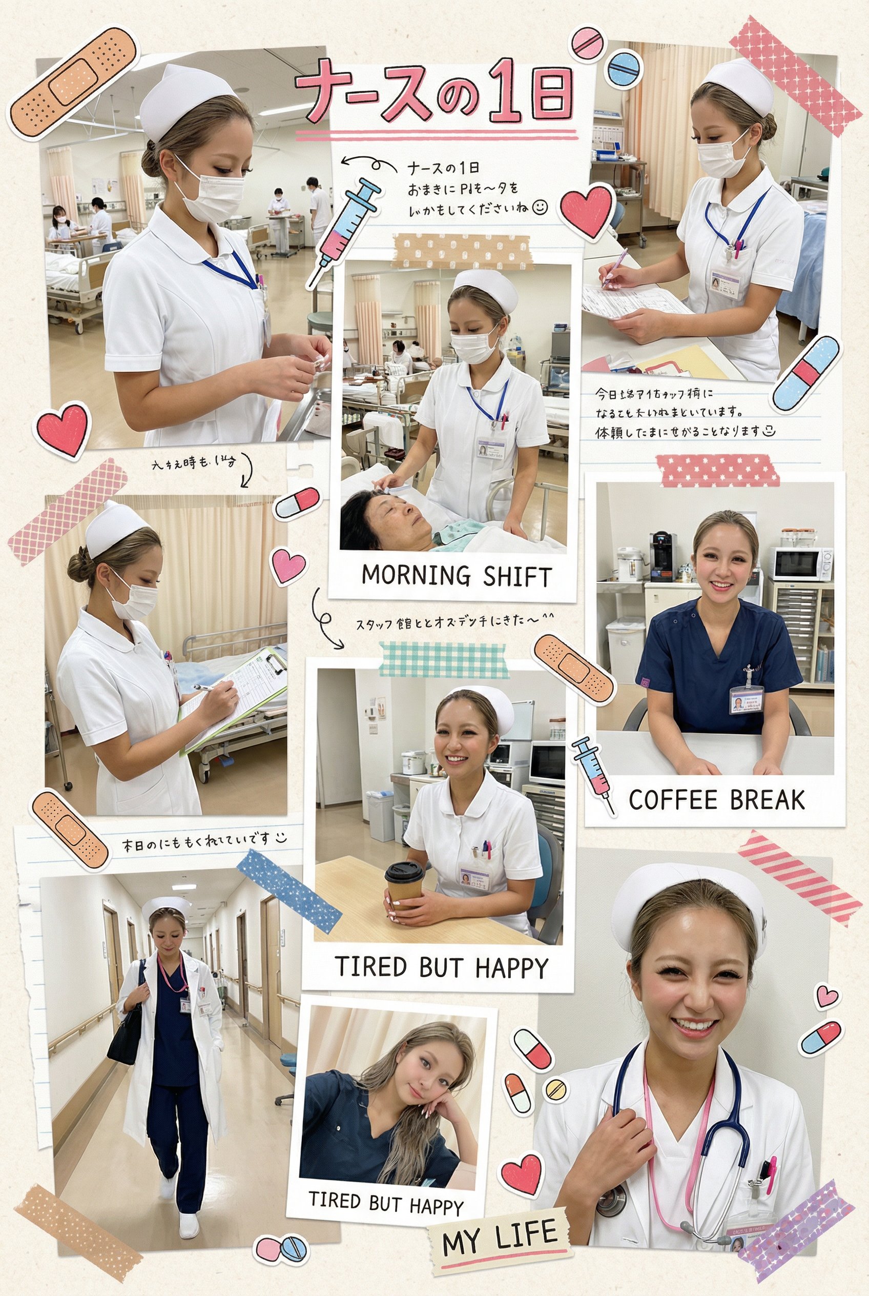 Tried arranging 'Banana Prompt' from a nice AI creator and was able to make super cute & funny works! Everyone try it too! #NanoBananaPro Reference one image and execute the following prompts. Left image uses: stylebook, collage, stickers, biker gang, tokko-fuku (gang jacket), lots of photos of same person. Right image arranged like: stylebook, collage, stickers, a nurse's day, nurse outfit, lots of photos of same person
