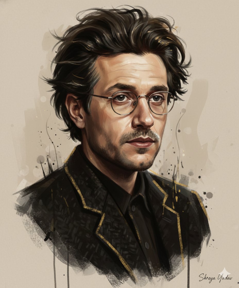 "style": "Moody, painterly semi-realistic portrait with dynamic brushstrokes and golden accents.",