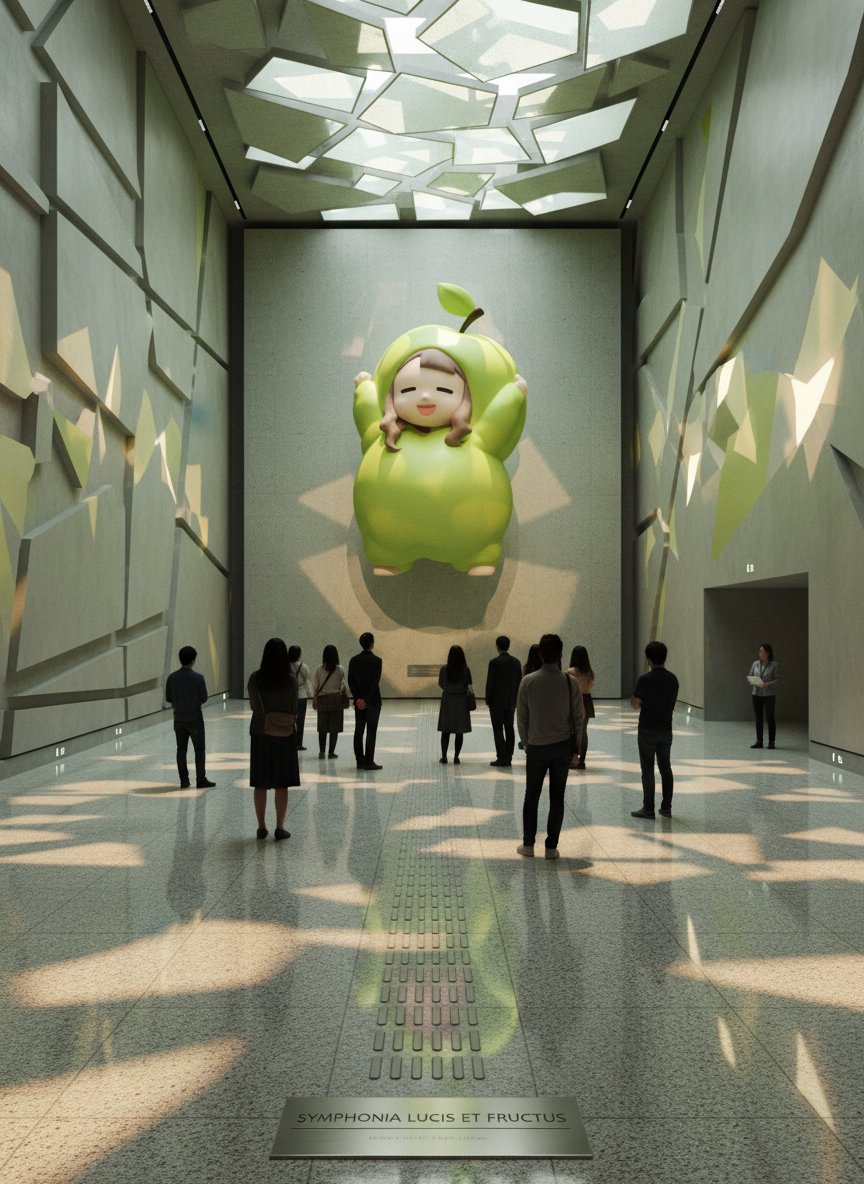 Prompt for generating contemporary art space using nano-banana! Input a prompt (Japanese OK) together with a reference image, and a contemporary art space will be generated. The space image and artwork title are automatically determined by the system. Prompt here: A avant-garde contemporary art exhibition space themed on the reference image. The entire hall (20.0 m × 20.0 m × 8.0 m) integrates architecture, lighting, floor, walls, and ceiling all as part of the artwork expression. At the far end stands a large 20m wide × 8m high wall, with the motif from the reference image shown as a huge artistic form in its center. The figure is vivid and three-dimensional, emerging toward the viewer and becoming the focal point of the space. At the center bottom of the large wall, a plate is installed with the **artwork title (Title)** generated by the system as the exhibition name. The title should be abstract, symbolic, poetic, and stand as a contemporary artwork. No price display. The floor is polished granite with 0.35-0.40 reflectivity. On the surface, patterns and light derived from the reference image overlap, resonating with the entire space in response to visitors' footsteps. Tactile paving is in matching colors blending in while maintaining 5m height bumps