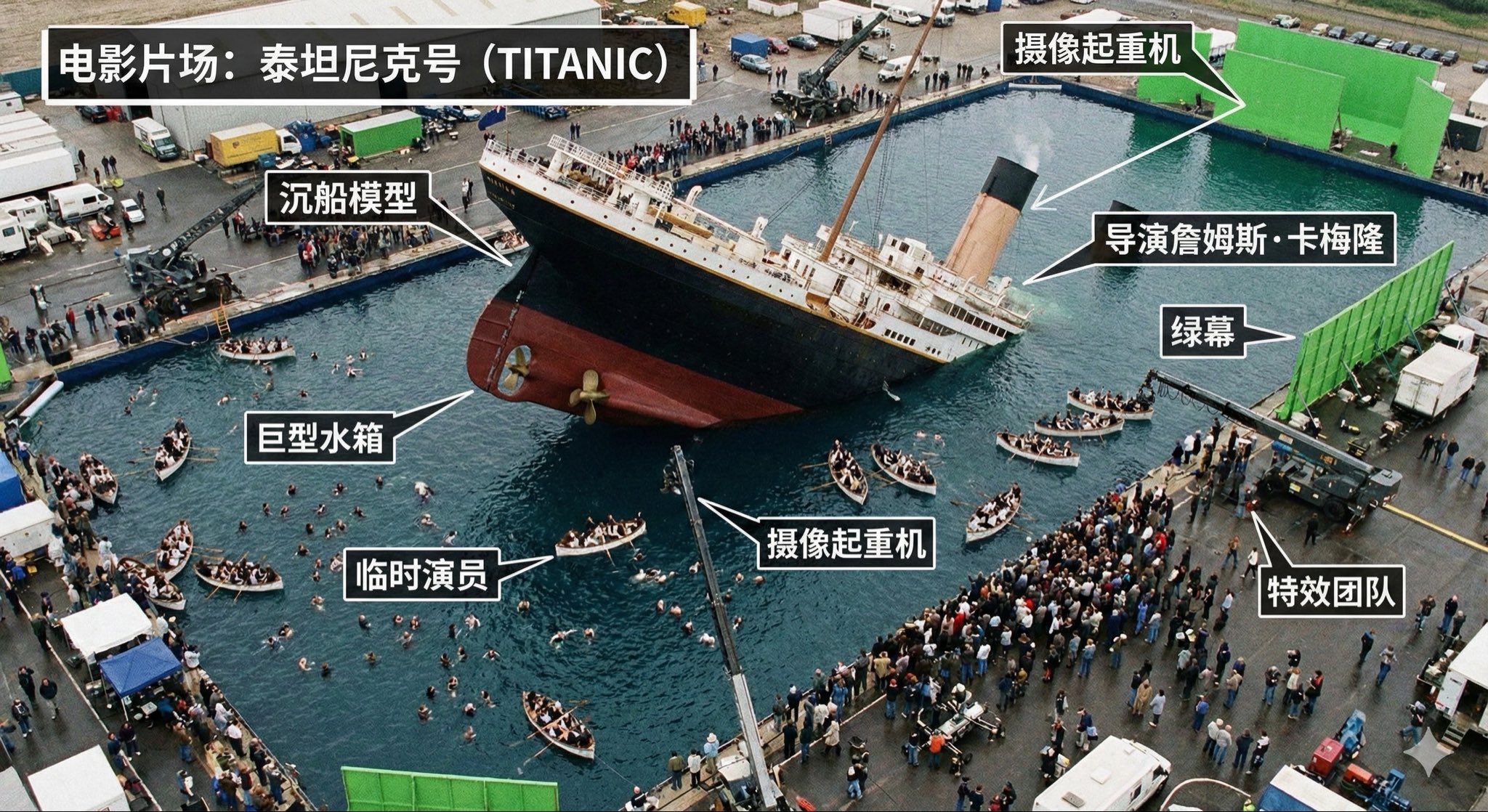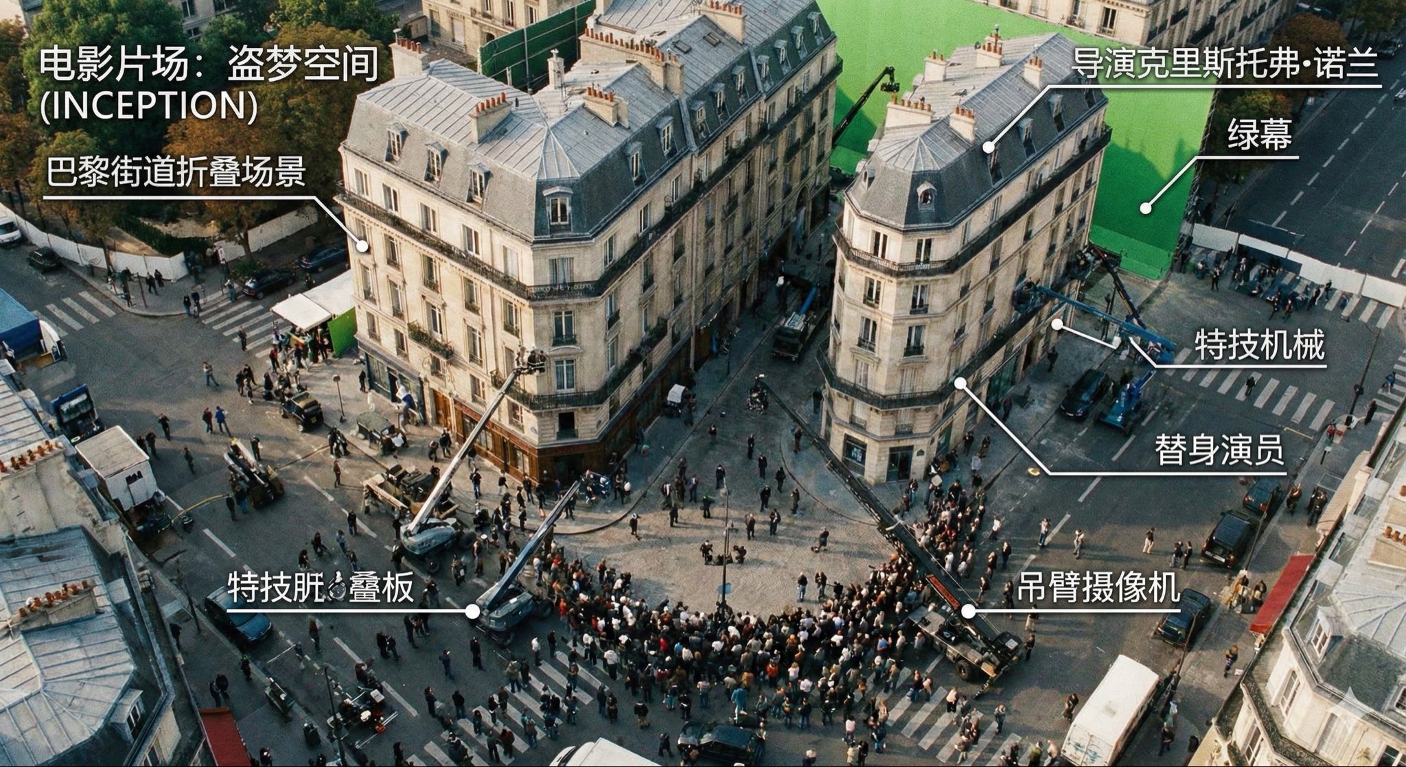 Can't stop laughing, banana really knows how to make things happen! Prompt: Generate an image, filming scene, aerial shot of a movie set scene, with annotation labels, the movie set is: If Going to Work Was a Play