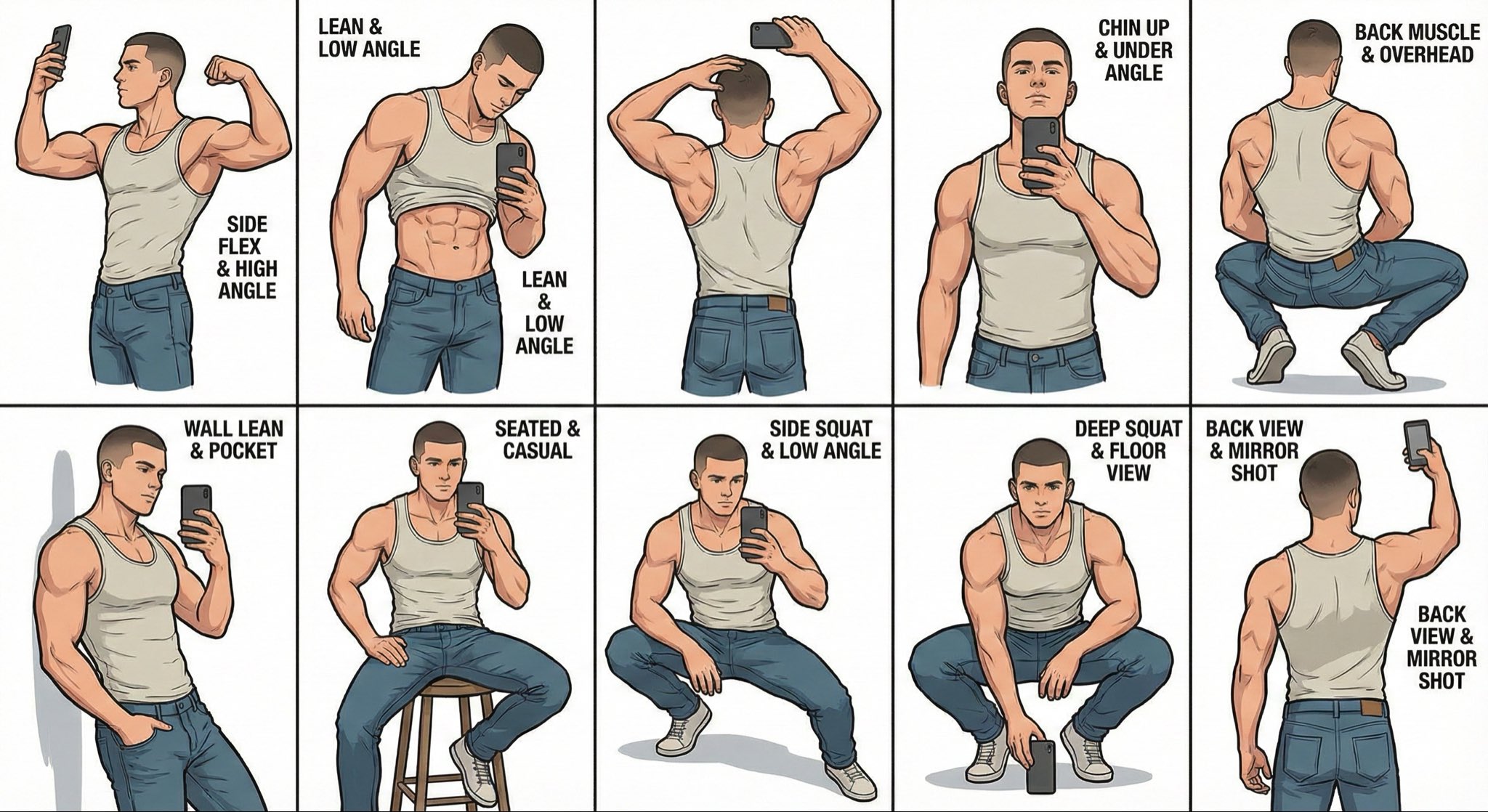 One prompt, selfies without asking for help. Share this with your significant other! Draw: Illustration-style action reference template for mirror selfie poses, model holding phone, no repeated poses. White background, grid format, annotated action guidance. Model: male, American crew cut, tank top, jeans, muscular