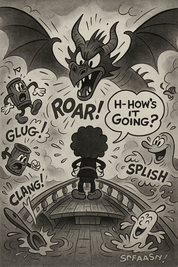 Transform this image into a 1930s animation storyboard in the style of Fleischer Studios. Use greyscale with expressive inky shading and rubber-hose limbs. Surround the scene with anthropomorphic objects, bouncy motion lines, and slapstick action. The overall tone should be jazzy, lively, and playful. Add hand-lettered sound effects and quirky dialogue signs.