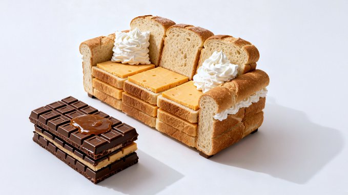 Photorealistic conceptual food art portrait, a minimalist representation of a [SITE OF THE HOUSE] recreated entirely with [TYPE OF FOOD]. The main structure is built from [MAIN INGREDIENTS], with details such as [KEY ELEMENTS] made from [SECONDARY INGREDIENTS]. Optional features include [ADDITIONAL OBJECTS OR FURNITURE] created from [EXTRA INGREDIENTS]. Set against a [COLOR] background to emphasize the surreal food sculpture. Bright soft studio lighting, evenly diffused, casting subtle natural shadows that highlight the textures of [FOOD TEXTURES]. Fine atmospheric detail enhance realism. Captured with a Canon EOS 5D, 85mm f/1.8 lens, shallow depth of field focusing on the cake-bed sculpture, crisp detail with soft falloff in the background. Composition framed at tabletop eye-level, medium close-up, perfectly centered. Clean high-resolution food photography style, vibrant natural colors, editorial dessert photography aesthetic