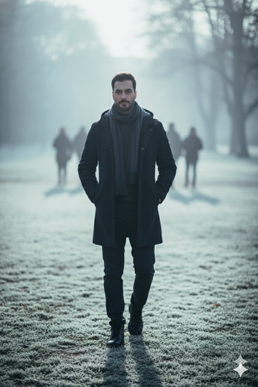 "pose": "standing at a frost-covered bus stop, arms folded against the cold",