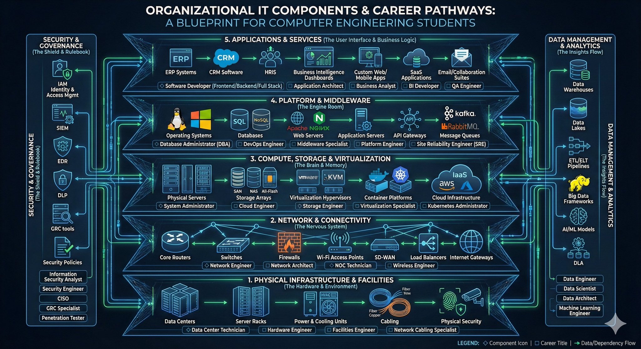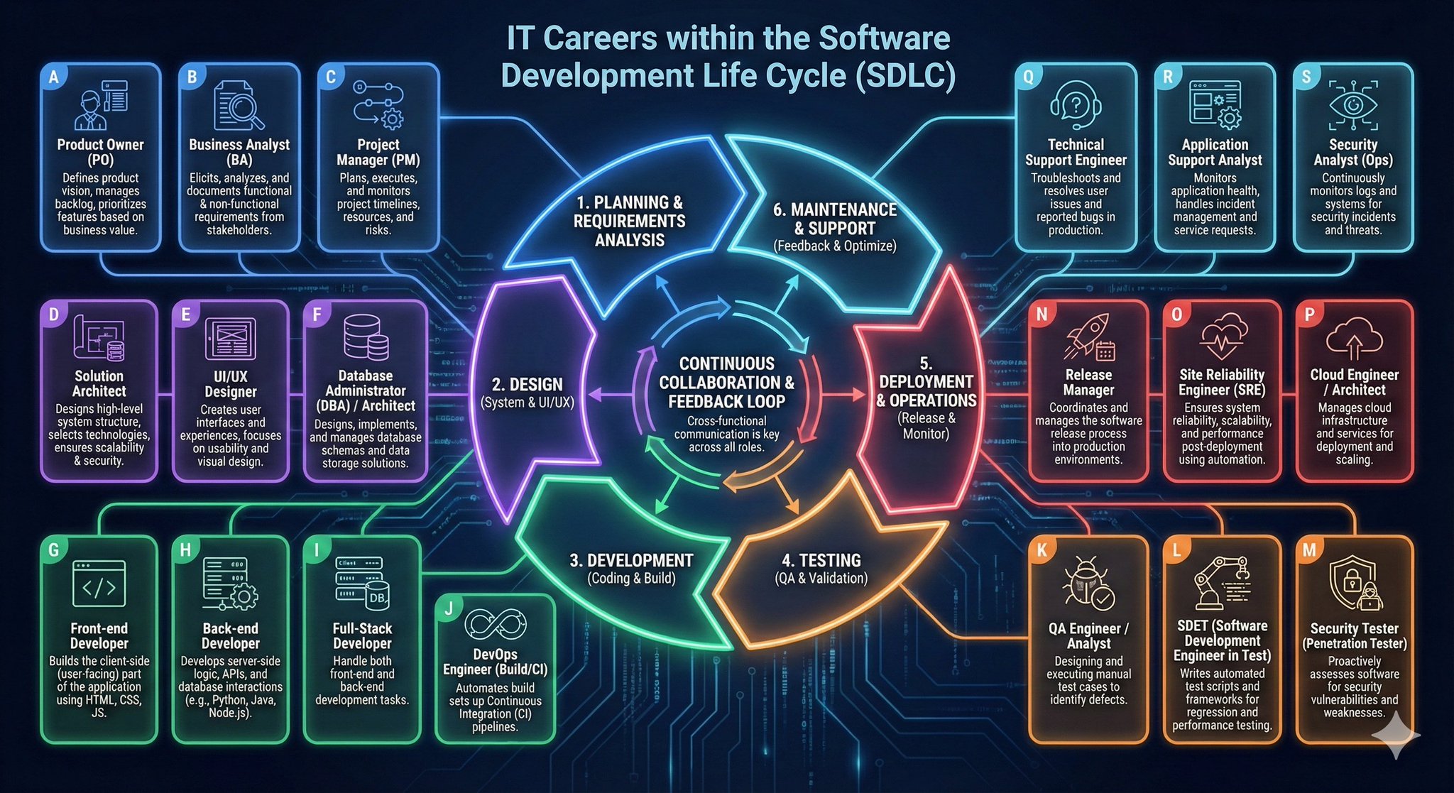 Create a highly detailed infographic describing IT careers or IT jobs related to the software development lifecycle.
