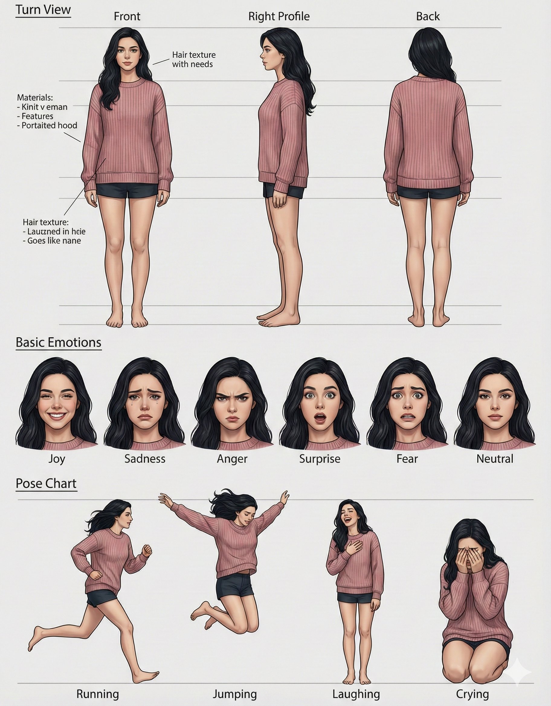 用新版Photoshop创建角色设计表 - 新建7680 x 4320 px - 放置照片 - 模型用Nano Banana Pro - 执行角色设计表提示词。提示词:请为这张照片中的人物创建详细的角色设计表。因为要用于真人电影,请注意不要变成动漫风格。请务必包含以下3种角色设定。创建完成后请删除原人物图像。- 从多角度描绘角色的转身图(三面图)- 包含喜、悲、怒、惊、恐、中性等基本情感状态的表情表 - 展示跑、跳、笑、哭等典型动作的姿势表