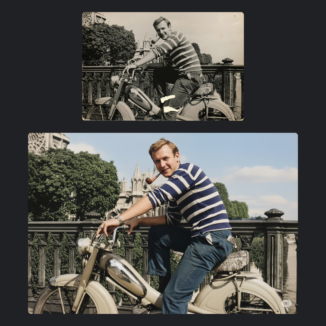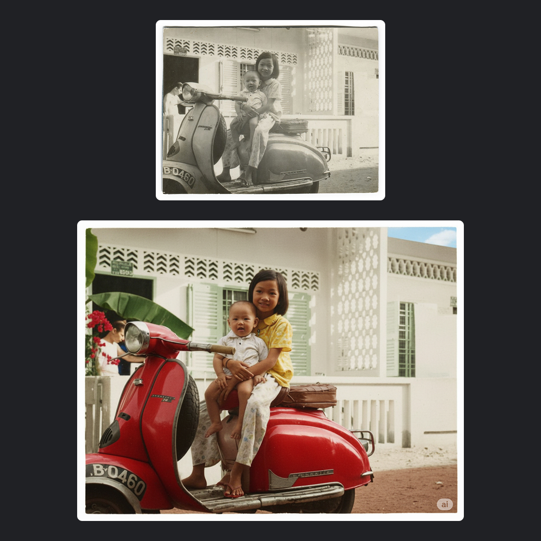 创建图像的可能性是无限的。你甚至可以为旧照片赋予新生命。看看修复过去最喜欢的照片有多容易: