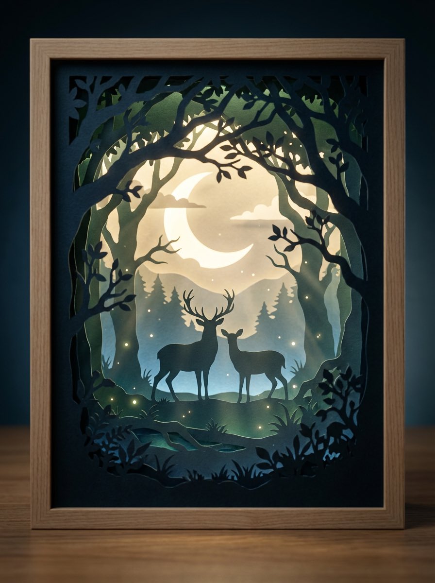 生成一张极具梦幻感和立体感的【3D 层叠纸雕灯箱(Paper Cut Light Box)】艺术摄影图。 纸雕的主题是:【月光下的森林鹿】。 一、分层结构与构图(Layering Logic): 请将画面设计为一个真实存在的纸雕灯箱,必须由 **5–7 层纸张** 叠加构成,每一层都有独立景深和清晰轮廓,并能看到纸张的厚度与层间的阴影。 1. 核心结构: - 画面呈现清晰的 **Multi-layered Silhouette(多层剪影)** 效果,纸层之间有可见的物理间距。 - 整体构图为竖版 3:4,灯箱主体居中,画面边缘留出少量空间,像一件被放在桌面上的发光艺术装置。 2. 景深布局: - 前景(第 1–2 层):使用深色、精细的剪影结构,在画面边缘形成框景。 元素需与当前主题相匹配,例如: · 森林 / 自然类主题:树枝、藤蔓、叶片轮廓; · 城市 / 城堡类主题:窗框、拱门、桥梁、栏杆、钢结构; · 海底 / 奇幻类主题:岩石拱门、珊瑚、残骸轮廓等。 - 中景(第 3–4 层):为本次主题的 **核心主体**,位于画面中景偏中心区域,占据主要视觉比重。 主体轮廓必须清晰完整,不可被前景结构过度遮挡。 - 远景(第 5–6 层):用更加简化、对比更弱的剪影,表现更远处的环境与背景结构,为画面提供空间深度。 3. 立体感: - 层与层之间要有明显的物理间距与阴影,光线在纸层之间形成柔和的明暗递进,突出纸张的厚度和 3D 深度,让画面看上去像一个真实摆放的纸雕灯箱,而不是平面插画。 二、光影与氛围(背光魔法): 1. 背光照明(Backlighting): - 光源必须来自画面的 **最深处 / 最后方**,从背景向前穿透所有纸层。 - 光线通过每一层纸张的镂空处形成柔和的体积光和由远及近逐渐衰减的亮度与对比。 2. 色彩渐变(根据主题自适应配色): 在未明确指定色彩主题的情况下,请根据当前纸雕的【主题】自动选择与之匹配的主色调与渐变方案,并始终保持柔和、适合做“夜灯”观赏的整体观感。示例逻辑如下(仅为参考方向): - 若主题偏 **森林 / 自然 / 童话**: · 采用【暖金色 / 柔和月光色 → 冷蓝 / 墨绿】的渐变, · 营造月光穿过树林、萤火虫点亮树梢的感觉。 - 若主题偏 **海底 / 深海 / 船只 / 珊瑚**: · 采用【青绿 / 蓝绿 → 深蓝 / 靛蓝】的冷色渐变, · 光源仿佛从水面或深海能量核心透下,带一点发光浮游生物感。 - 若主题偏 **冬天 / 雪景 / 极地 / 冰晶**: · 采用【冰蓝 / 冷白 → 浅紫 / 深蓝】的清冷渐变, · 有雪夜反光、冰晶折射的安静质感。 - 若主题偏 **赛博都市 / 城市夜景 / 霓虹街道**: · 采用【黄昏琥珀金 / 橙色 → 电蓝 / 靛紫】的对比渐变, · 在建筑和招牌上点缀少量青蓝、紫粉霓虹,但保持柔和,不要刺眼。 - 若主题偏 **古堡 / 中世纪城镇 / 烛光场景**: · 采用【烛光金 / 暖橙 → 靛蓝 / 深紫夜空】的渐变, · 像远处城堡的窗户刚刚亮起。 - 若主题偏 **星空 / 宇宙 / 太空航行**: · 采用【深蓝 / 靛青 → 紫色 / 轻微金色光晕】的宇宙渐变, · 星光和星云略带金色或青紫的柔和发光。 若用户在主题中 **明确指定色彩方向或氛围**(例如“冷色科幻感”“粉蓝梦幻系”“黑金神秘感”), 则以用户指定的色彩为最高优先级,在此基础上保持纸雕灯箱的柔和背光效果与治愈气质。 3. 整体观感: - 画面应充满静谧、治愈、童话般的感觉,像一个轻柔发光的睡前故事灯箱, 而不是嘈杂刺眼的霓虹海报或信息图表风格。 三、材质与细节(Material & Details): 1. 纸张质感: - 强调 **高克重艺术纸** 的真实质感: · 纸面有细腻纹理和轻微可见的纸纤维; · 切割边缘干净锐利,纸层边缘有明确厚度; · 光线透过时形成柔和的漫反射与微弱透光,而不是塑料或金属质感。 2. 实体灯箱摄影感: - 画面需要呈现为 **实物灯箱的摄影作品**,而不是平面插画或数码向量风格。 - 可以隐约看到灯箱的外框结构(如简洁的白色或浅木色框),以及轻微虚化的桌面或摆放环境。 - 整体光感自然,带有真实镜头的景深效果:前景稍微虚化,中景主体清晰,背景柔和。 3. 细节装饰: - 在纸层之间可以点缀少量微小、悬浮的点状元素,用来增强空间感,例如: · 星点般的微光; · 轻微的尘埃颗粒; · 雪花、气泡或与主题相关的微型光点。 - 数量必须克制,只作为氛围和空间的点缀,不得破坏整体剪影结构与层次关系,也不能让画面变得杂乱。 【技术参数示例】 竖版 3:4 比例,高分辨率输出