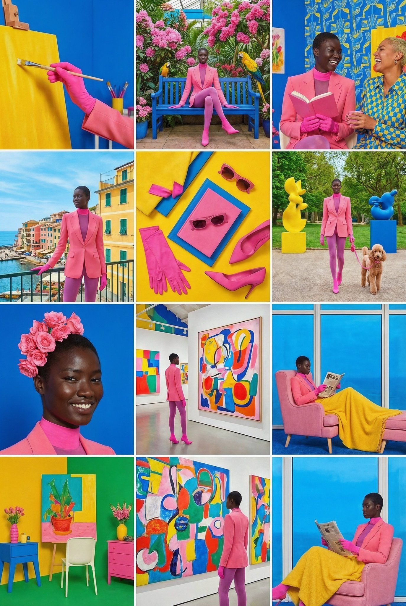 为这个角色创建一个包含 12 张图片的 Instagram 动态,保持相同的审美风格。使用粉色、蓝色、黄色等鲜艳的色彩。运用不同的地点、角度和构图,融入人物、动物、自然和各种环境,同时保持视觉风格的统一性。