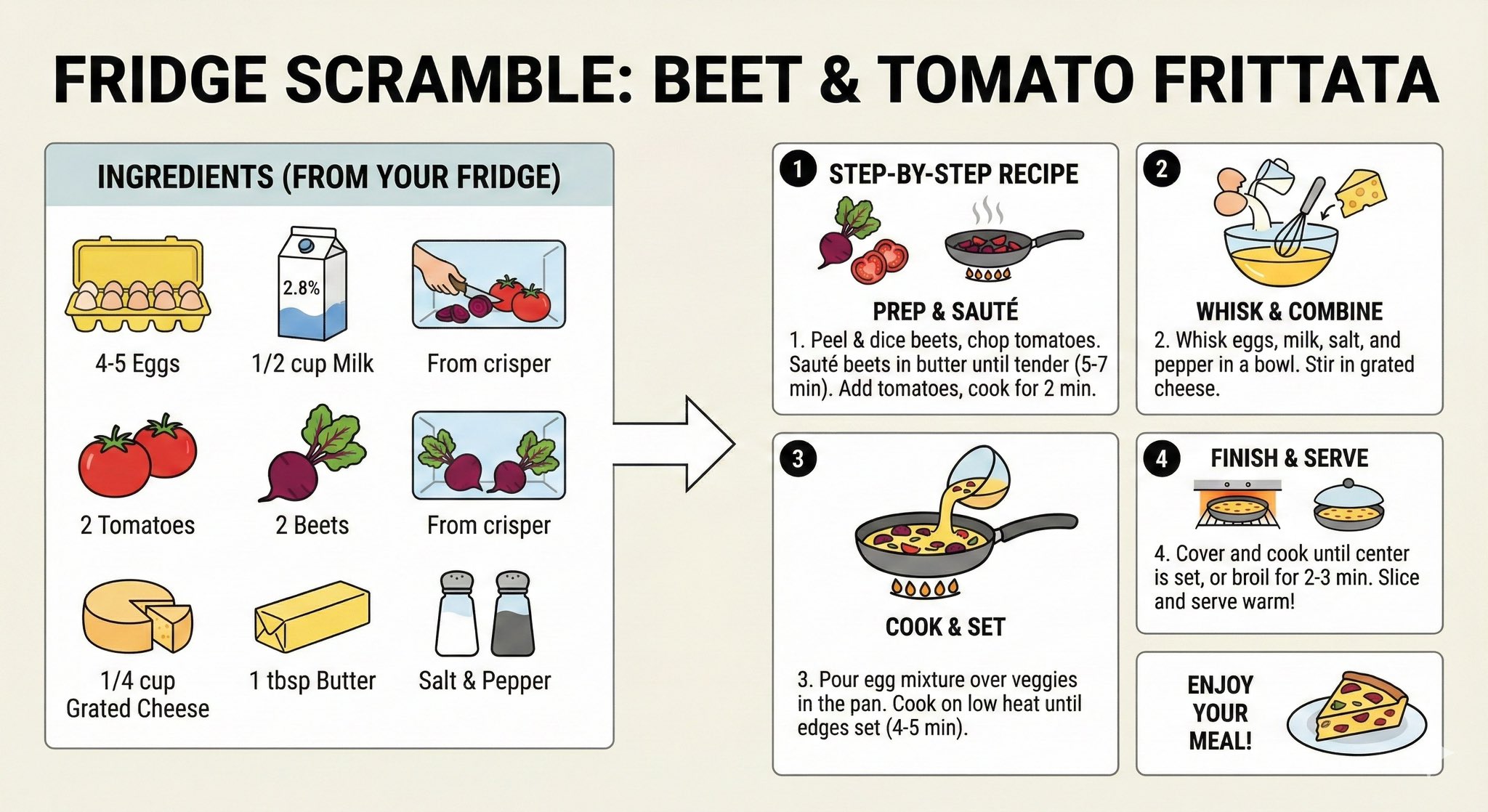 扫描 冰箱 里的食材,并根据现有食材建议可以烹饪的菜肴,提供详细的分步食谱,以简单的信息图形式呈现。